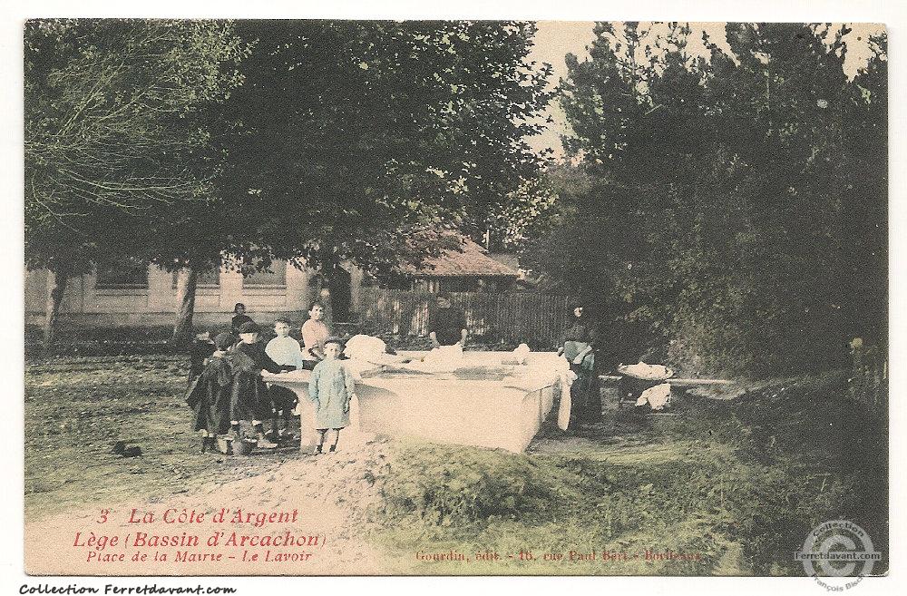 Le premier lavoir de la place de l'ancienne mairie de Lège que le maire Henri Guérin (1881) fit construire au début du siècle. Il sera couvert d'un toit de bois par le maire suivant, Osmin Gayet (1920). Vous pouvez toujours voir l'ancienne mairie devant le collège Jean Cocteau de Lège. La date d'agrandissement, 1888, est gravée sur son fronton. Mais point de Lavoir... Sur Lège, seul le lavoir de l'entrée sud (avenue de la mairie) et celui de l'avenue du Médoc sont encore visible.