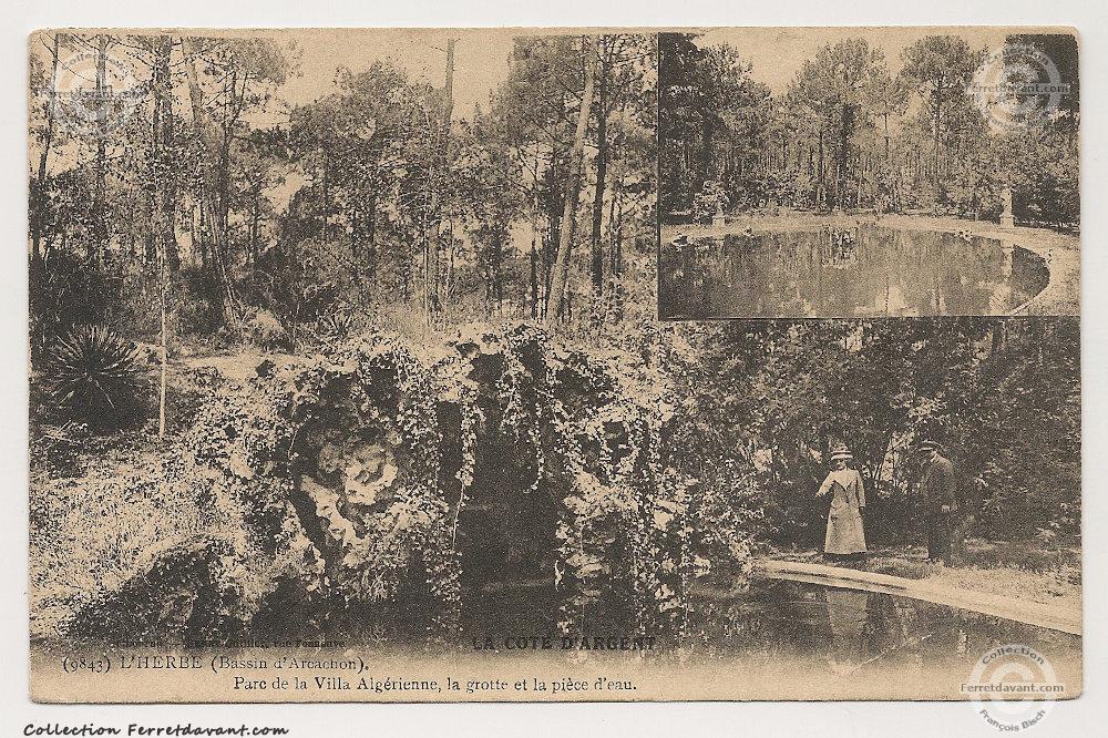 La grotte de la villa Algérienne de Léon Lesca. Elle possède en son centre (sous le lierre que l'on voit ici), les initiales de Léon Lesca avec la date 1900 dessinées avec des coquillages. Cette grotte est toujours visible sur la dune de l'Herbe mais n'est plus que l'ombre d'elle même : l'étang à disparu et le surplomb en pierre d'alios est tombé. La "grotte" n'est donc plus aujourd'hui qu'un simple mur au bord d'un parc arboré (