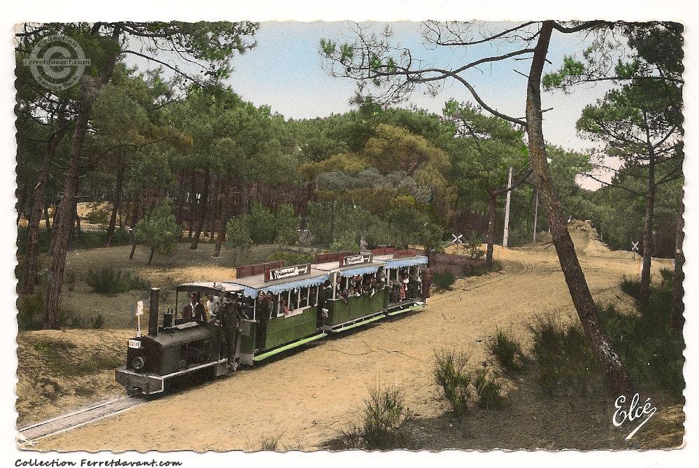 Vue en fausse couleur, du petit train du Cap-Ferret à l'angle de la la rue des Lilas et de l'avenue des Genêts. Pas une seule villa n'est encore construite. Même pas de route. Que du sable et la forêt (voir la même vue aujourd'hui). Par contre, dans le petit train, c'est la foule des grands jours. Pas une place de libre à bord... Au milieu de tous ce vide, c'est paradoxale d'être si serré!