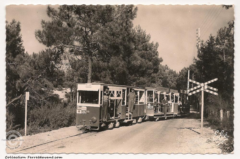 L'existence d'une double voie, rue des Lauriers, permet le croisement et les manœuvres de deux rames. Cette nouvelle et deuxième automotrice utilisée pour le petit train du Cap-Ferret mesure a elle seule 8 mètres de longueur ! Elle est constituée de deux parties : A l'avant, la cabine de pilotage et le moteur et, à l'arrière, un petit compartiment pour les passagers. Même si la carte est postée le 12 juillet 1960, la photo est de juin 1957. Nous sommes au croisement Bremontier, le train est pilotée par le conducteur-électricien Henri Laforet. On peut voir sur cette photo que la carcasse métallique de la carrosserie n'est pas encore terminée. Il manque les portes du moteur et de la cabine de conduite ! Cette automotrice recevra en 1958 un pantographe(*) factice pour "faire plus vrai" [Source : Luc Dupuyoo - Livre n°15] On retrouve cette automotrice dans sa configuration terminée sur la carte n°1898.
