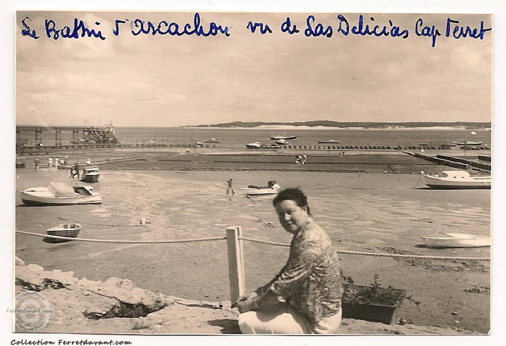 Cette fois-ci, c'est le mari qui prend la photo de sa femme au bord de la terrasse du restaurant Las Délicias (voir carte photo n°1006). Face à nous les parcs à huitres, le débarcadère Bélisaire, le Bassin et la côte d'Arcachon. ________________ Comme toujours, si vous reconnaissez ces personnes et que cette photo est importante pour vous, contactez-moi et je me ferais un plaisir de vous l'offrir