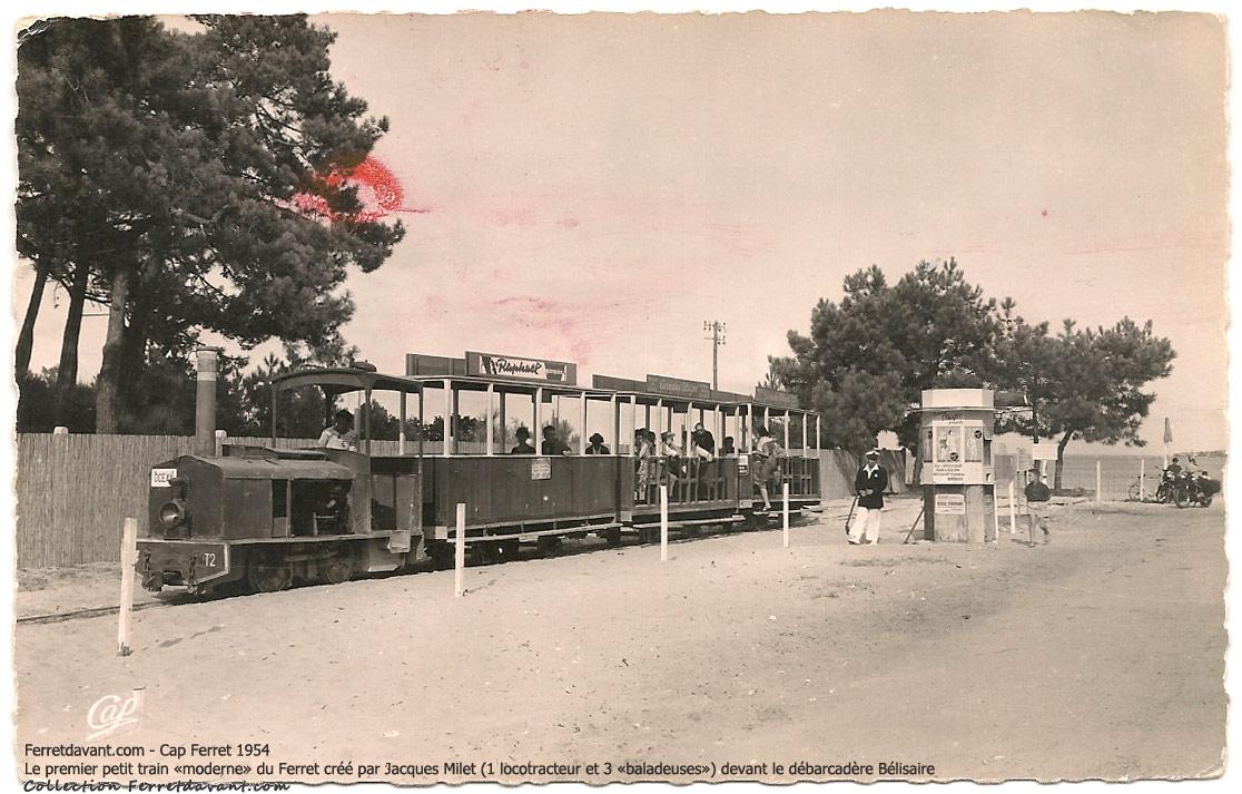 Suite à une sombre affaire de terrain, le départ du petit train devra être déplacé un peu plus à l'ouest, devant l'hôtel du Panier Fleuri. Pendant des années les touristes d'Arcachon devront marcher jusqu'à ce nouvel emplacement pour aller à l'océan. Finalement, la mairie décide de transformer l'allé Bélisaire en zone piétonnière et fait construire la gare de départ de Bélisaire que l'on utilise aujourd'hui. Remarquez la pub pour l'apéritif "Saint-Raphaël" au dessus du petit train ainsi que le kiosque à billet avec la pub pour les maillots de bain "Germaine Ollagne".