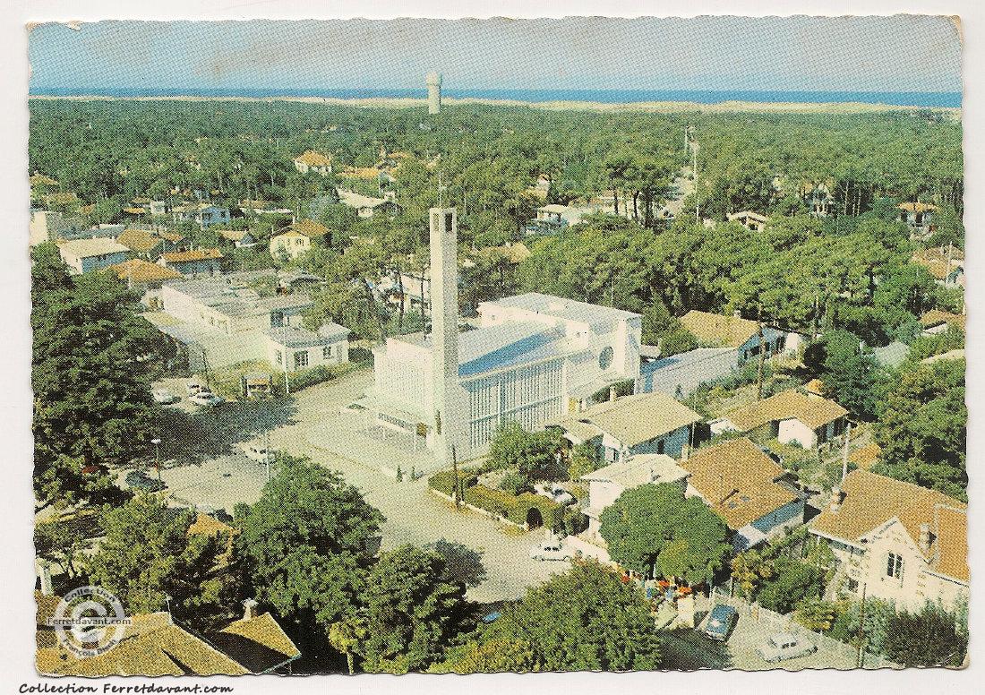 Vue d'avion de l'église du Cap-Ferret. Au fond, le château d'eau à ne pas confondre avec le Sémaphore invisible ici. En bas à droite, la villa Domremy du boulevard de la plage. Entre la maison de la presse, à gauche et le garage à bateaux Nautic Hall de Claude De Lépinay, une toute petite maison au toit bleu dans un grand jardin devenue aujourd'hui une grande maison dans un tout petit jardin comme c'est de mode au Cap-Ferret. Au pied du clocher on distingue à peine la vierge en cuivre réalisée par le sculpteur Hugues Maurin.