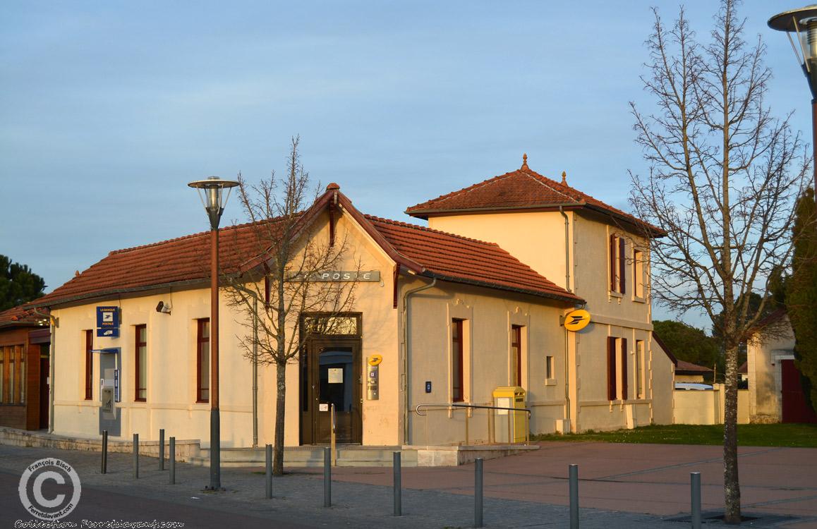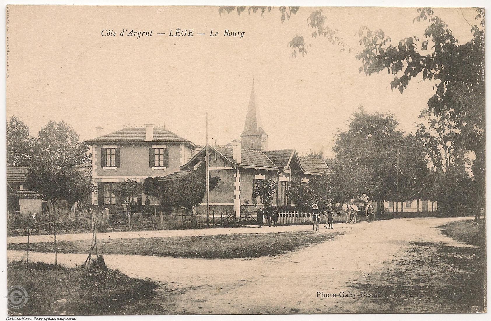 Vue depuis l'actuel petit rond-point du restaurant Le Chat Toqué (ex Café Goubet). Au premier plan, le café Villetorte (aujourd'hui la Poste) et au deuxième plan, l'ancienne église Saint-Pierre de Lège rasée et reconstruite en 1928. Le café Villetorte offrait une terrasse qui avait la particularité d'être invisible depuis la route et surtout du parvis de l'église. Les maris pouvaient donc continuer de trinquer sans que leurs femmes, allant à l'église, ne puissent les voir.
