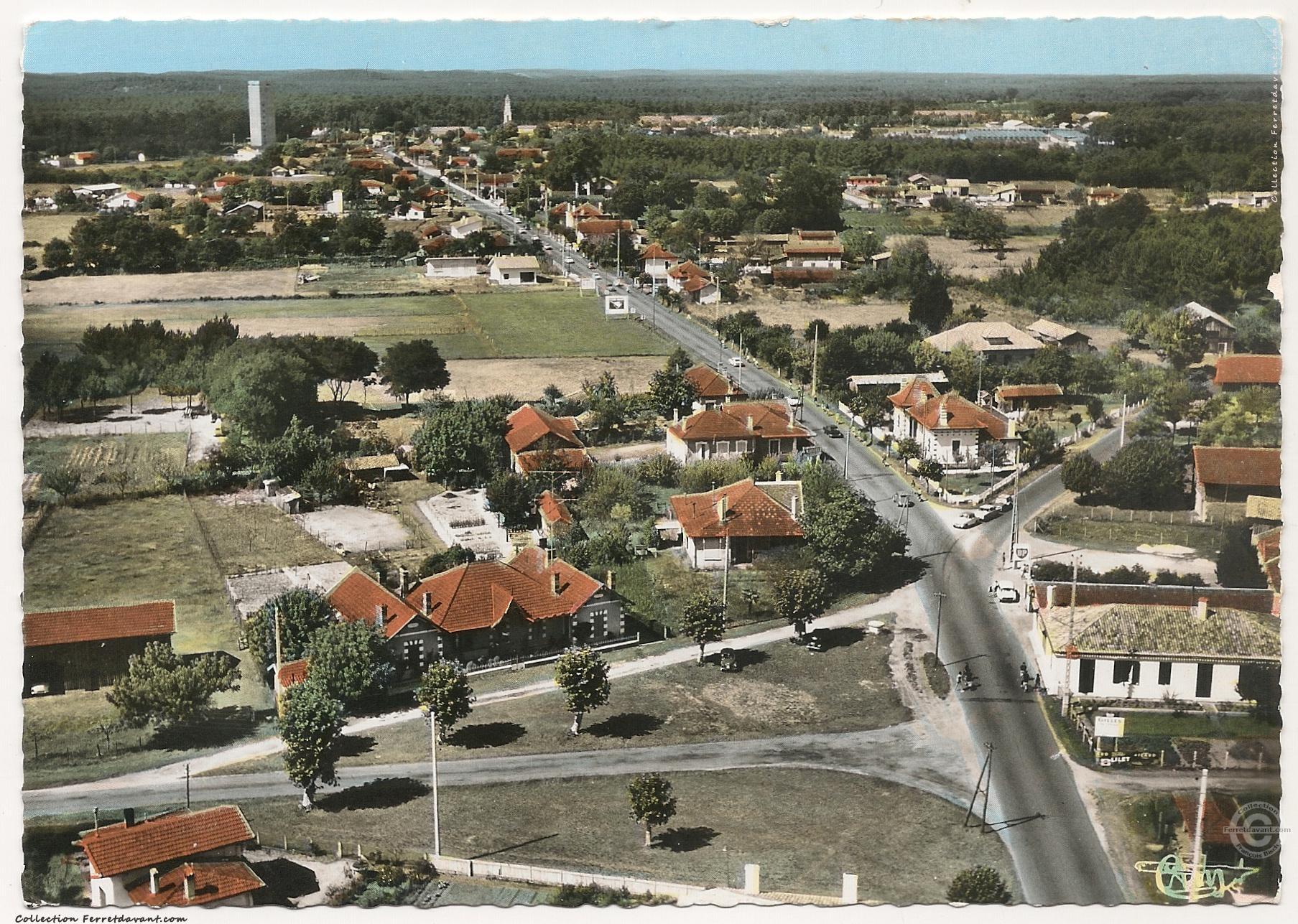 Vue aérienne de l'entrée sud du bourg de Lège (croisement du quartier Ignac). A partir du bas de la carte et au premier plan à droite, on aperçoit le lavoir (toujours là aujourd'hui). On voit le logo de la station d'essence BP et le bâtiment du restaurant "Chez Patate" (qui deviendra une discothèque, aujourd'hui, c'est un terrain vide). La villa blanche (l'ancienne boucherie Despujol) qui fait l'angle est toujours visible aujourd'hui. A l'arrière plan on voit l'imposant château d'eau de Lège (dit "Le Toblerone", allez savoir pourquoi :-) qui était à l'emplacement de l'entrée de l'actuel stade municipal Louis Goubet de Lège Cap-Ferret (inauguré en 1997) juste derrière l'ancienne poste. En bas de la carte, remarquez les publicités pour les marques Lilet et Ricard en bord de route!
