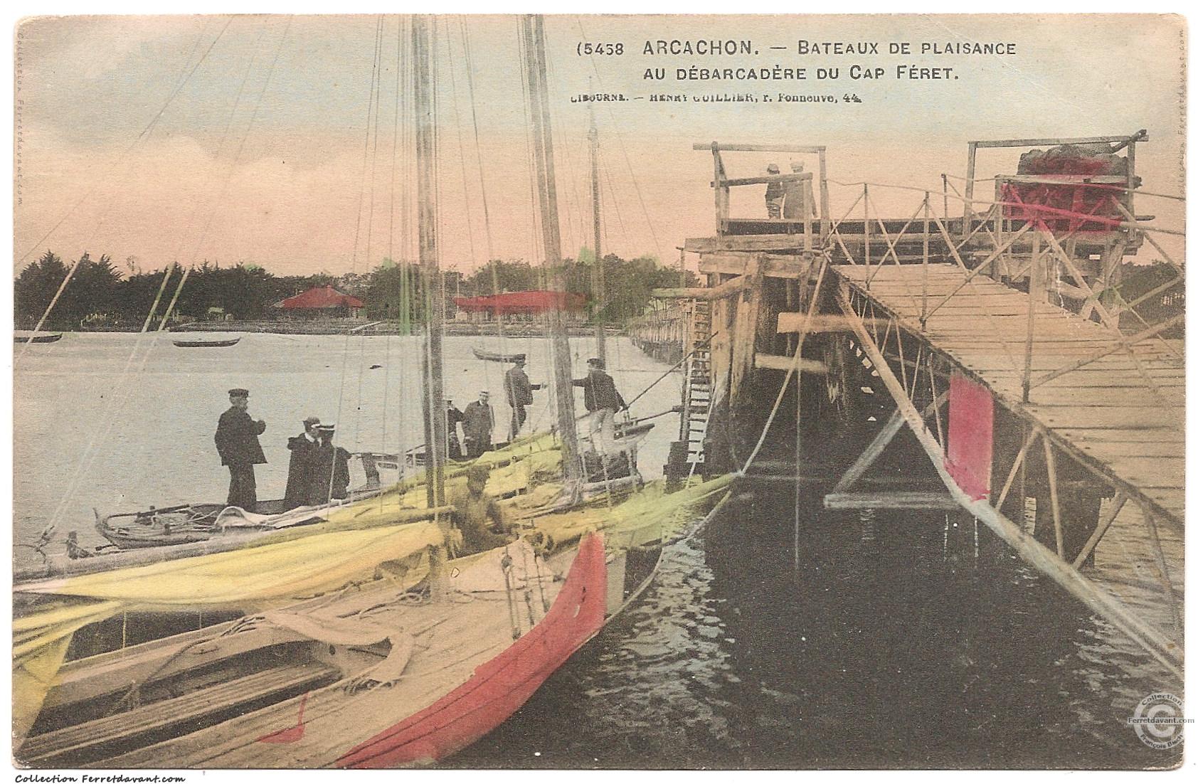 Des bateaux de plaisance devant le premier débarcadère du Cap Ferret tout en bois. Notez, sur la carte, l'orthographe du nom Cap Ferret. Il sera détruit et reconstruit au même endroit par un second débarcadère en fer pour être remplacé en 1972 - mais un peu plus au nord - par la jetée d'aujourd'hui