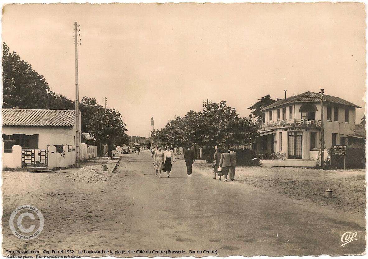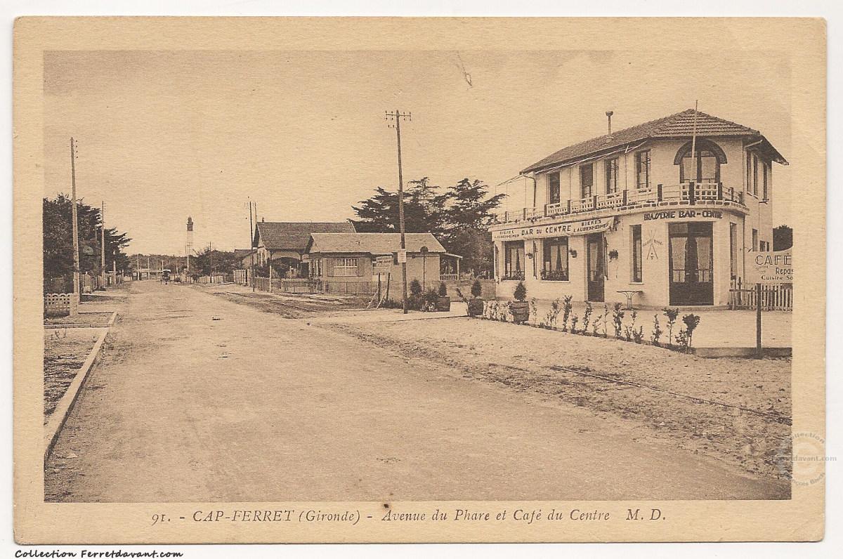 Carte postale représentant le phare et boulevard de la plage du Cap Ferret (ex avenue du phare) et le Café du Centre (aujourd'hui fermé). Le bâtiment est toujours debout et tout à fait reconnaissable de nos jours. Remarquez les poubelles en métal de couleur crème disposées le long du boulevard de la plage : les éboueurs ne sont pas encore passés :-)