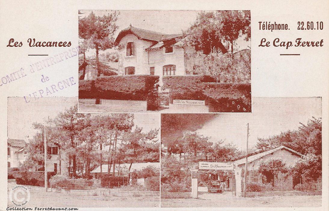 Carte postale de la pension de famille "Les Vacances" du Cap Ferret identifiée par Christophe Baumann qui ma indiqué l'emplacement de cette villa aujourd'hui devenue une habitation privée. Cette carte comporte un cachet du Comité d'Entreprise de L'Epargne (?) avec, au dos, à nouveau le cachet du Comité d';Entreprise de L'Epargne et le caché de Mme Maumont - Cap Ferret barré au stylo avec l'inscription "Propriété du". La carte à probablement été utilisée après le rachat de cette villa mais avant que de nouvelle carte ne soit réalisées.