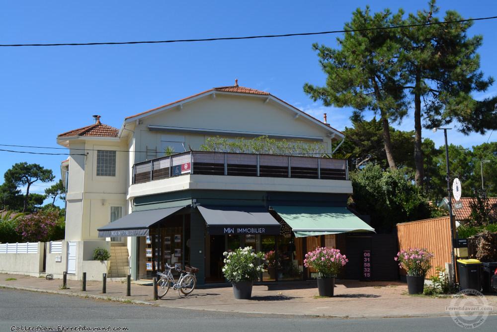 Le chalet Monier (villa Gurechantzea) et les Nouvelles Galeries dans les années 30. Le chalet est aujourd'hui parfaitement conservé. Remarquez les rails du petit train qui menaient à la pointe du Cap Ferret : cette ligne Bélisaire/La pointe Océan est créé en 1925 par la Compagnie d'Entreprises Immobilière afin de desservir les terrains qu'elle avait en vente.