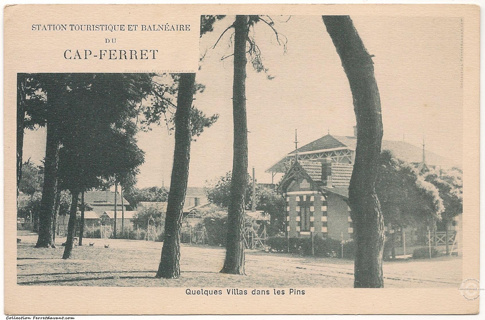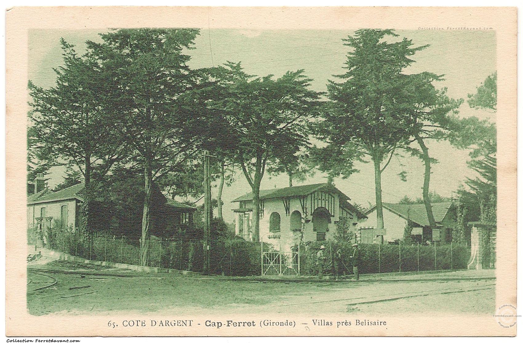 Les villas de l'avenue de l'océan au Cap-Ferret dans les années 1930 en allant vers Bélisaire. Remarquez les rails du petit train qui menaient à la pointe du Cap-Ferret : cette ligne Bélisaire/La pointe Océan créé en 1925 par la Compagnie d'Entreprises Immobilière à aujourd'hui totalement disparue.