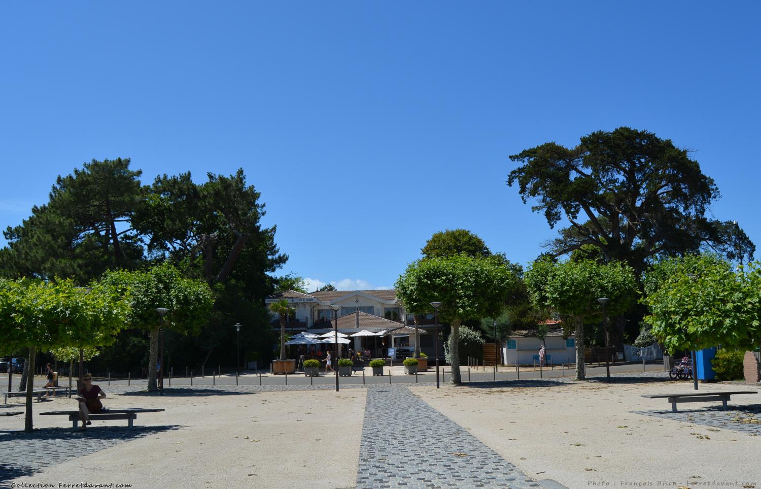 Vue d'avion de la place du centre du Cap Ferret (aussi appelée place du manège et actuelle place Walter Reinhard1). La villa Eglantine avec son étage est face à nous. La villa Eglantine a vécu de grands changements en 2006/2007 puisqu'elle fut transformée en un hôtel par l'animateur de télévision Pascal Bataille et son épouse Adra (l'hôtel Côté Sable). Sur la gauche et face au Bassin, les villas Mamie-Robert, Madura, Suzalda Belle Plage, Les Rosiers et Caprice. Derrière la villa Madura, le café du Centre. Remarquez que la place du marché du Cap Ferret est encore un petit bois et que le château d'eau n'est pas encore construit. Sur la droite de la carte, on aperçoit l'étale blanc des Nouvelles galeries de Gérard Pel