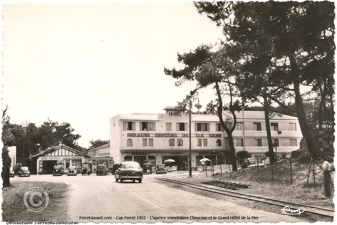 A gauche du Grand Hôtel de la Mer, l'agence immobilière Cheyroux du "Lotissement du Cap Ferret" (Vente de Terrain). A la place de l'agence immobilière Cheyroux s'installera une banque (avec un - si rare à l'époque - distributeur de billet) qui sera elle même remplacée par l'entreprise de conception et vente de cuisines puis par le magasin Hoalen Ocean Store d'aujourd'hui.