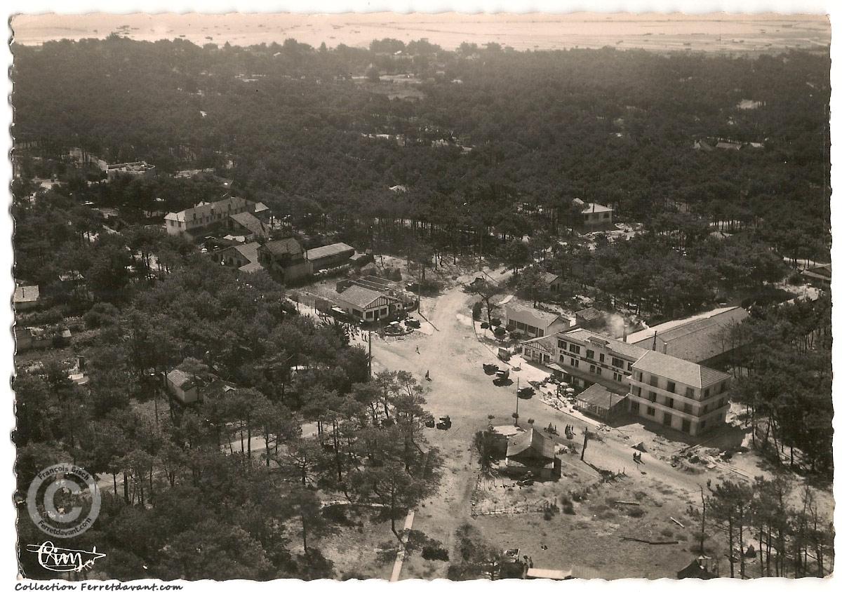 Vue d'avion du carrefour du Pavillon Bleu (de dos) avec, en face, le garage, la pâtisserie Lune de Miel, l'agence immobilière Cheyroux et le Grand Hôtel de la Mer en 1948 (la nouvelle aile du Grand Hôtel viens d'être construite). Remarquez qu'il n'y a pas encore au sol les rails du petit train. La ligne actuelle du tramway ne sera construite par Jacques Milet qu'en 1952. Remarquez aussi le garage Antar à gauche (futur villa La Méralenne) avec les pompes à essence ronde à portes de type SATAM. A gauche en haut de carte, on distingue le toit de l'Hôtel de la Côte d'Argent qui n'ouvrira jamais.