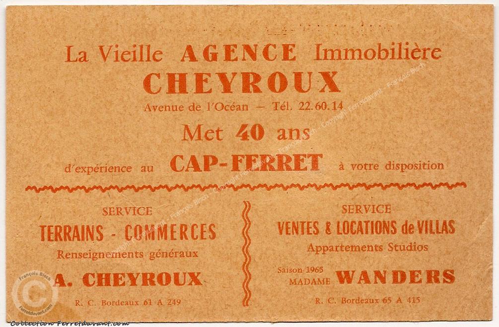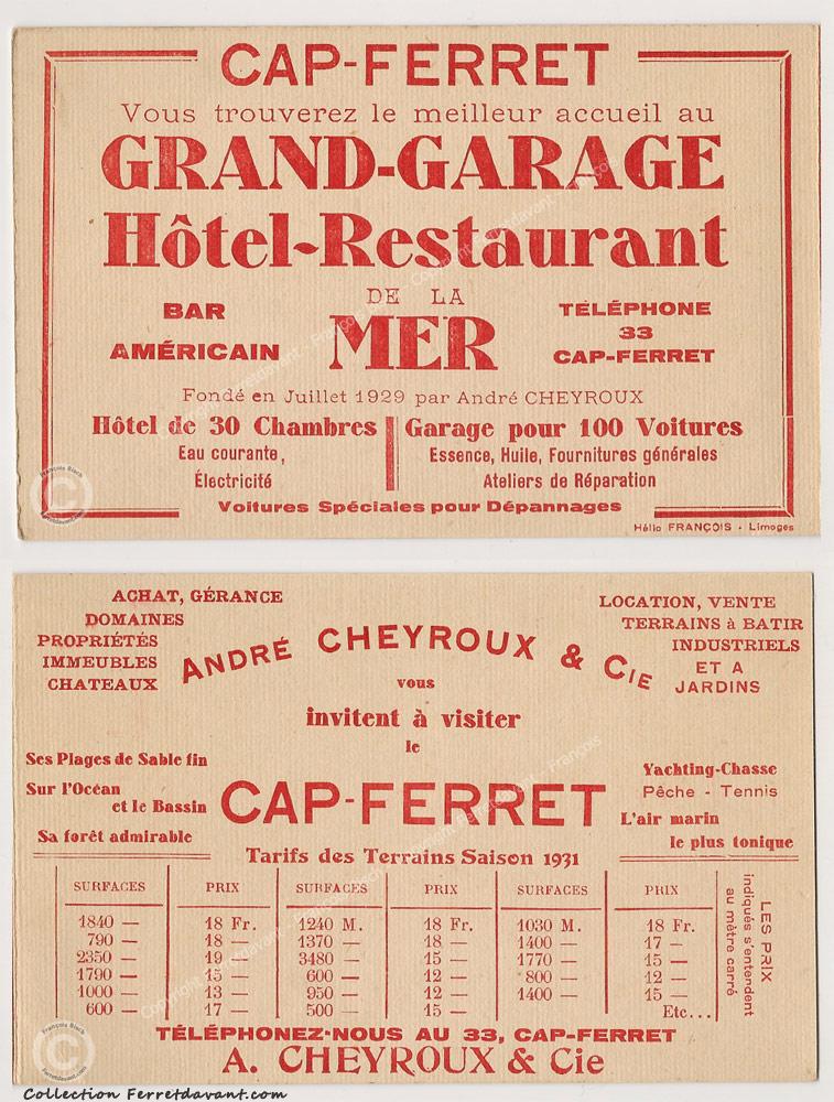 C'est André Cheyroux qui crée en 1929 l'agence immobilière Cheyroux et la société anonyme Bélisaire des Grands Garages Français. Il se fera construire son agence immobilière contre le Grand Garage qui deviendra le Grand Hôtel de la Mer. Sur la carte du haut, pub pour le Grand Garage hôtel restaurant de la Mer du Cap Ferret qui deviendra le Grand Hôtel de la Mer. Cet hôtel, aujourd'hui disparu, était en face de l'actuel Pavillon Bleu sur le chemin de la plage de l'Horizon. Sur la carte du bas, pub pour la vente de terrain au Cap Ferret réalisé par André Cheyroux - Prix 1931 : 18 Fr. le M². Notez le texte en haut : "Garage avec Essence, Huile" et celui du bas : "L'air marin le plus tonique".