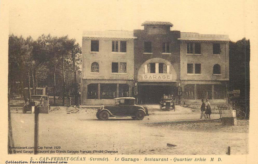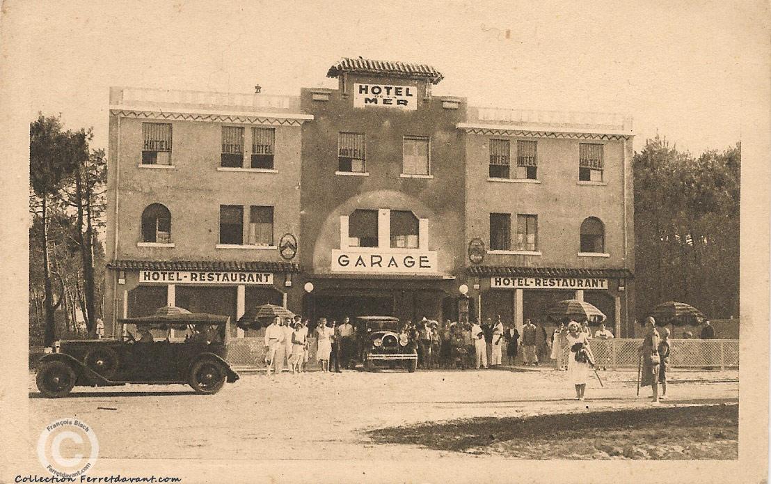 Le Grand Hôtel de la Mer (aujourd'hui disparu) à d'abord été en 1929 le Grand Garage. Un garage restaurant avec chambre pour chauffeur : La nouvelle route depuis Claouey venait d'être percée à travers la forêt et on espérait voir venir de nombreuses voitures... Le projet du fondateur André Cheyroux du Grand Garage Français était ambitieux car, en plus des places en façade, il y avait une très grande cour sur l'arrière pour garer plus de 100 voitures! Vous pouvez remarquer que la carte est notée Quartier Arhie : c'est à l'époque le restaurant Chez Arhie qui donne son nom au quartier. Le restaurant Chez Arhie deviendra ensuite Le petit Robinson, l'Annexe du Grand Hôtel et enfin Le pavillon Bleu.
