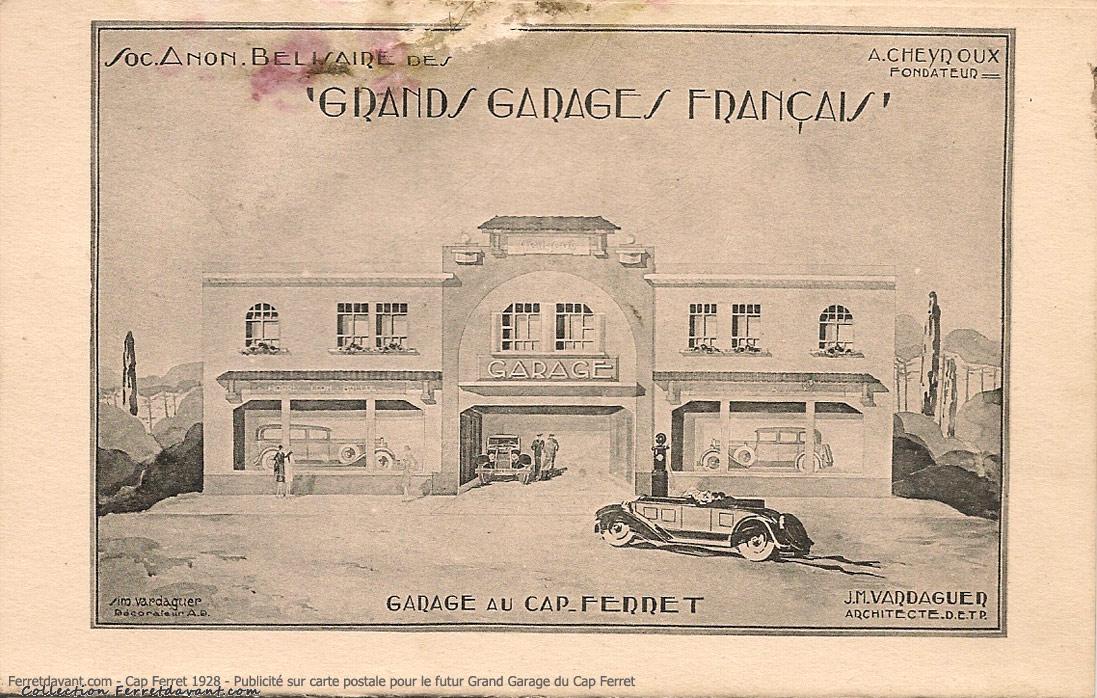 Pub pour le Grand Garage Français du Cap Ferret qui deviendra le Grand Hôtel de la Mer (aujourd'hui disparu). C'est André Cheyroux qui crée la société anonyme Bélisaire des Grands Garages Français. Il se fera construire son agence Immobilière contre le Grand Garage. L'architecture Art nouveau est signée J.M. Vardaguer.