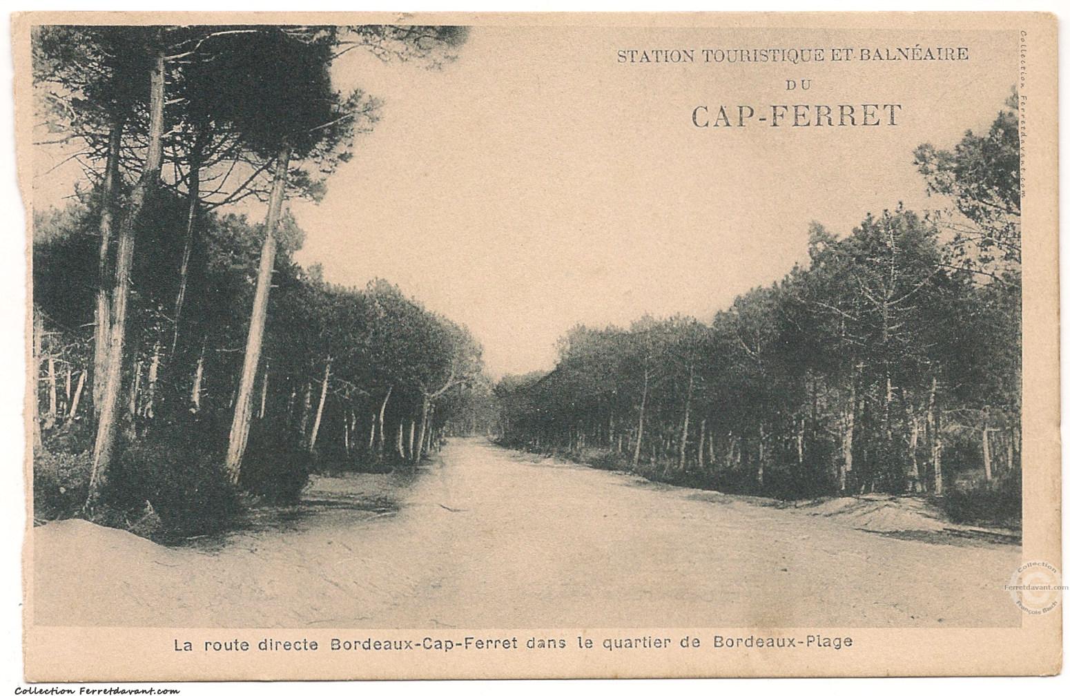 Carte postale promotionnelle éditée par la Compagnie d'Entreprises Immobilières qui avait en charge la vente des terrains du centre du Cap-Ferret acquis lors de l'échange Labro de 1919. Le cahier des charges imposait la construction des routes. Le Cap-Ferret est alors divisé en six quartiers dont celui de Bordeaux-Plage qui se trouvait entre le phare et l'océan. Nous sommes sur l'avenue de Bordeaux, à l'ouest du phare dans les environs de l'actuel hôtel des Dunes.