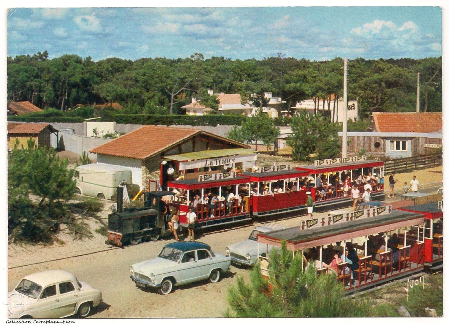 A peine caché par le petit train du Cap Ferret (dont le chauffeur est en grande conversation :-) et juste à côté du Pavillon Bleu et face à au Grand Hôtel de la Mer (invisible ici), le bazar de plage "La France" dans les années 1960. Aujourd'hui, c'est l'école de Surf "Alex". A l'arrière plan sur l'avenue de Bordeaux, le bâtiment blanc de la station service Petrovitch - Esso qui est restée pendant de longue années un garage à bateaux.