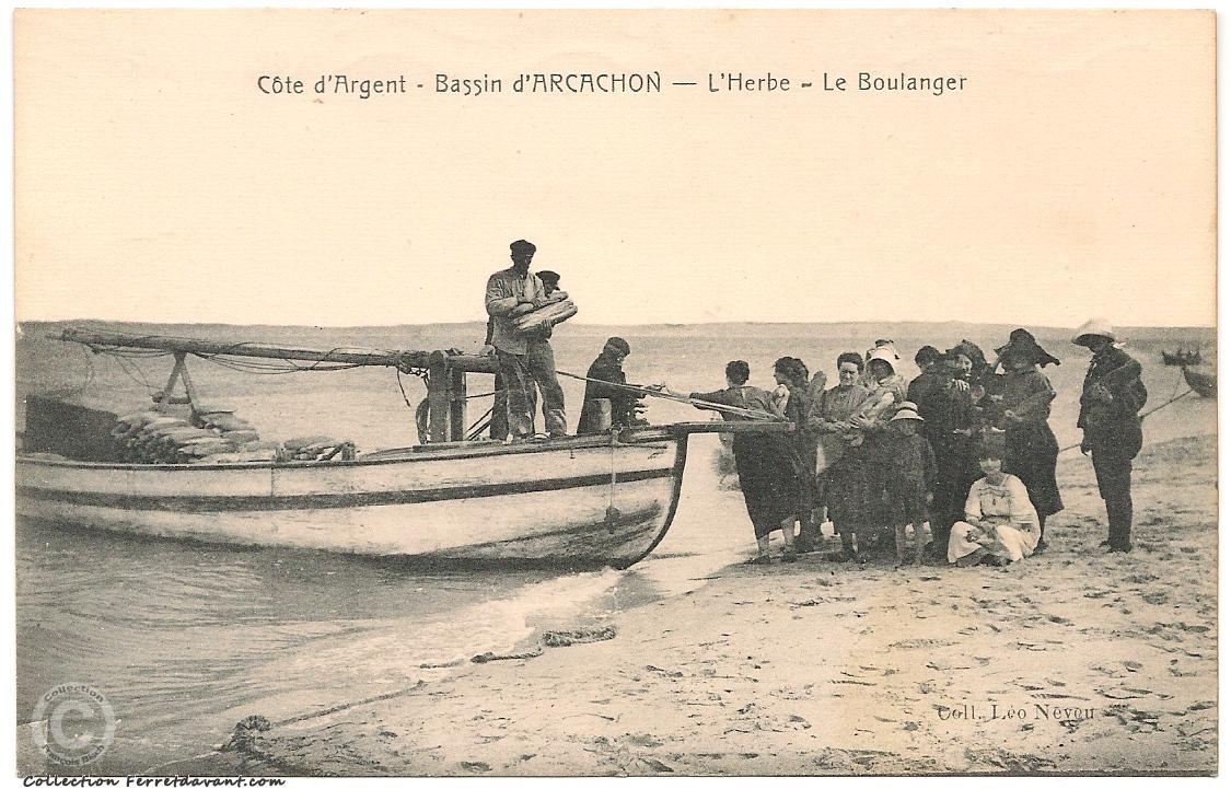 village de l'Herbe. Il est vrai qu'a l'époque la route n'existait pas encore. On reconnait ici le bac à voile "Les deux frères", patron Edmond Mène et le boulanger Dehillotte apportant le pain d'Arcachon (