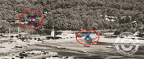 « La croix bleu, c'est l'écluse qui alimente les réservoirs. A sa droite, notre plage habituelle. La croix rouge indique notre place dans le camp, on y distingue assez bien notre île. La ligne blanche à l'horizon, c'est une immense dune qu'il faut franchir pour atteindre l'océan après avoir marché 3 km dans une piste à travers les pins. Au premier plan, le début des parcs à huitres appelés couramment "Champs de vignes" par les vieux landais à pantalons rouges » Voir