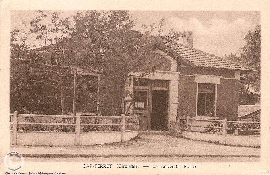 Au pied du Phare, la nouvelle poste du Cap Ferret dans les années 1940 qui donne son nom à la rue : rue de la poste. Le bâtiment qui abrita le premier bureau de poste était situé rue des Pêcheurs (derrière le phare). Ce bureau de poste était tenu par Mme Bourseguin et son mari en était le facteur. Ils vivaient dans la villa Beausoleil encore visible rue des Goélands (Source: Max Baumann).
