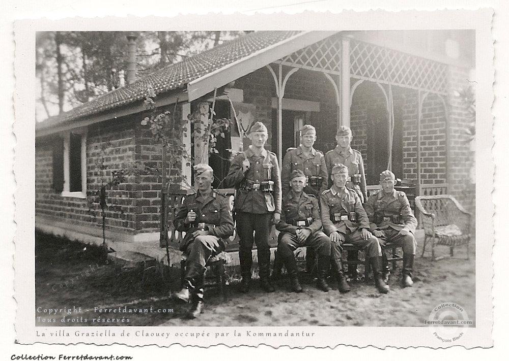 Photo amateur de soldats allemands qui posent devant la villa Graziella de Claouey réquisitionnée pendant la seconde guerre mondiale pour la Kommandantur. Cela fait plus d'un an que j'ai cette photo mais ce n'est qu'a la relecture de l'ouvrage de Jean-Marie Brossard(1) que j'ai compris qu'il s'agissait de la villa Graziella que j'avait déjà répertoriée avenue Toulouse Lautrec.
