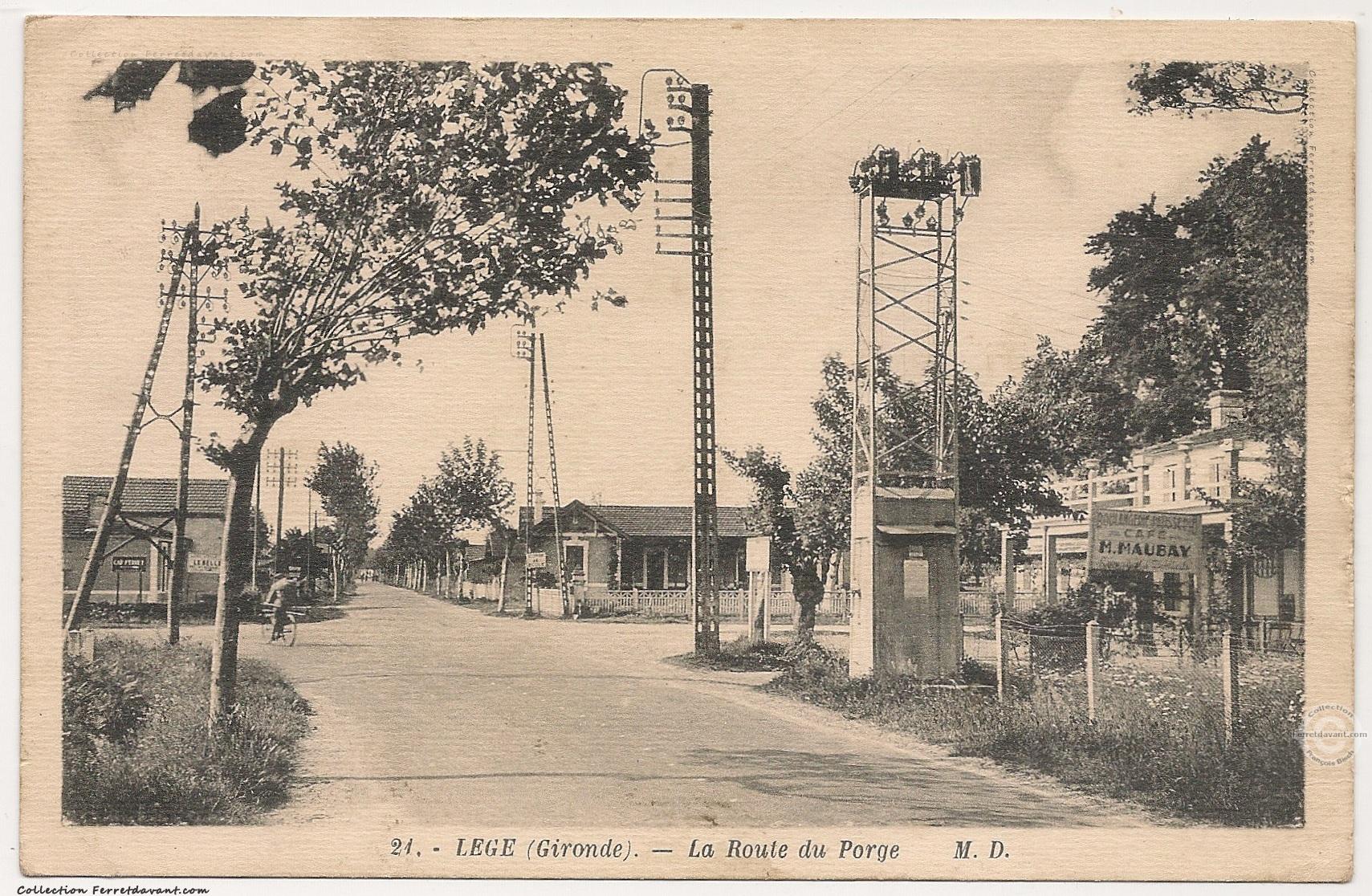 La route du Porge, soit le croisement de la route Arès - Lège centre et Grand Crohot Cap-Ferret - Lacanau. A droite la boulangerie pâtisserie café M. Maubay (aujourd'hui, le Fournil de Lège de la famille Anduberteau). Face à nous, la villa Gayet et la fontaine. A gauche, un panneau pour la Cap-Ferret et une publicité pour l'hôtel restaurant Le Bellevue de Grand-Piquey.