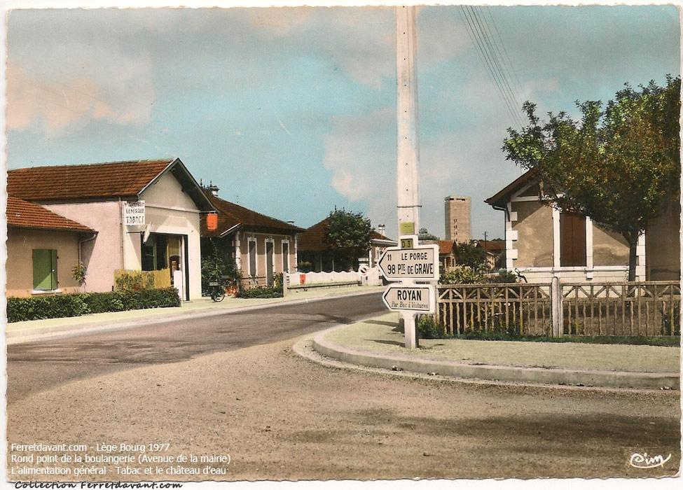 Lège bourg en 1977. Le rond point de la boulangerie. Remarquez le château d'eau de Lège centre (surnommé le Toblerone) encore debout (démoli en 2002). Sur la maison blanche à gauche, on distingue à peine la carotte signifiant un tabac. Un Vélo-solex est garé devant. Le panneau blanc indique "Alimentation Générale - Tabac". Cette petite maison est toujours visible aujourd'hui sous l'enseigne "Bacino Pizza" de Patrick Seyrès. A gauche, l'angle de la villa du snack "La route des Plages" qui deviendra en 2016 "Les 3 Palmiers".