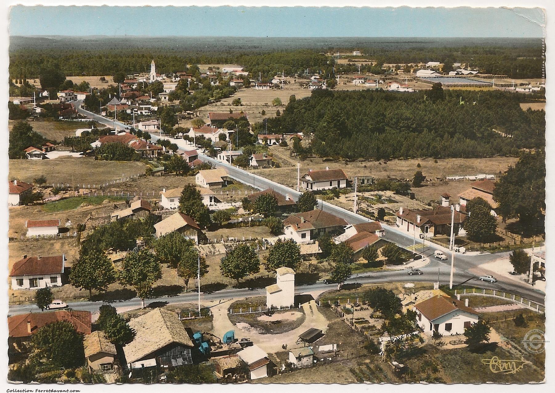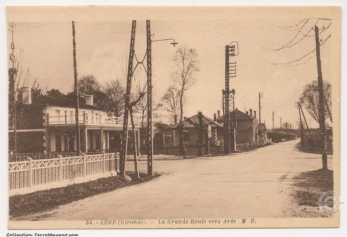 Le croisement de la route d'Arès et du Grand Crohot avec la boulangerie de la mère Mivielle devenue, entre 2003 et 2011, La Mie des Pins de Noëlle et Ludovic Valli. Aujourd'hui, c'est le Fournil de Lège de la famille Anduberteau. Derrière la boulangerie, une villa et l'hôtel Boissin de la famille Boy remplacé depuis par la résidence de Lescourre (dans laquelle se trouvait le salon de Véronique : Atlent'is Coiffure). Sur la gauche de la photo, on voit un mât d'honneur dans le jardin de François-Osmin Gayet qui vient d'être à nouveau élu maire de Lège. Retrouvez cette carte dans l'actualité de novembre 2021.