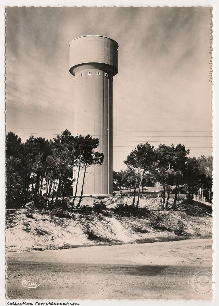 La distribution d'eau potable au Cap Ferret est assurée le 1er avril 1957 par 30km de canalisations desservies par ce château d'eau de 49m de haut et de 500 000 litres alimenté par une batterie de forages profonds. La Société nouvelle du Cap Ferret, qui avait en charge la viabilisation et la vente des lotissements, remet le réseau d'eau à la Compagnie générale des eaux le 6 juin 1967 [Source : Bulletins de la SHAA - Livre n°1]. A noter qu'il sert aussi de relais antenne aux opérateurs de téléphonie, se qui peut parfois créer quelques frayeurs.