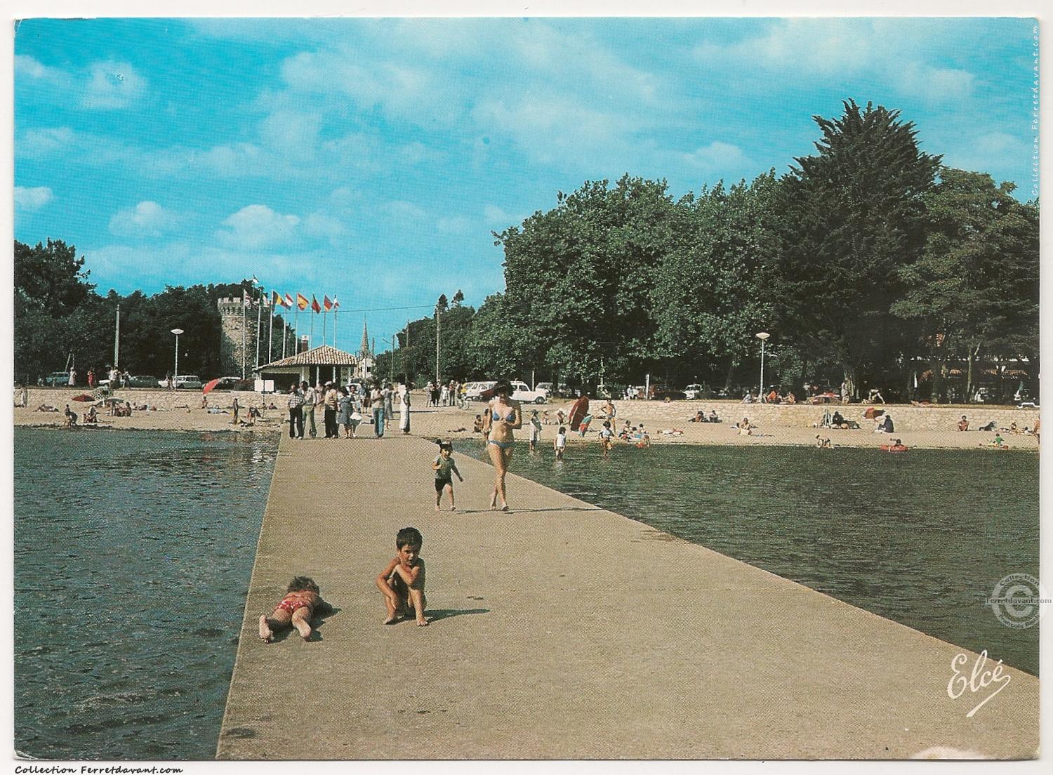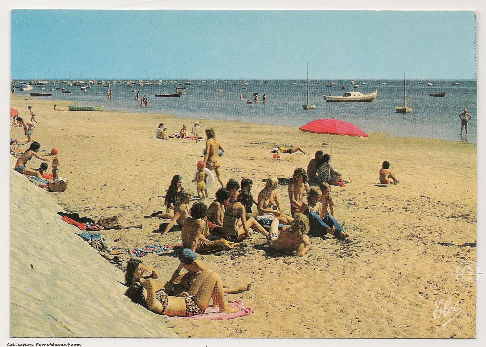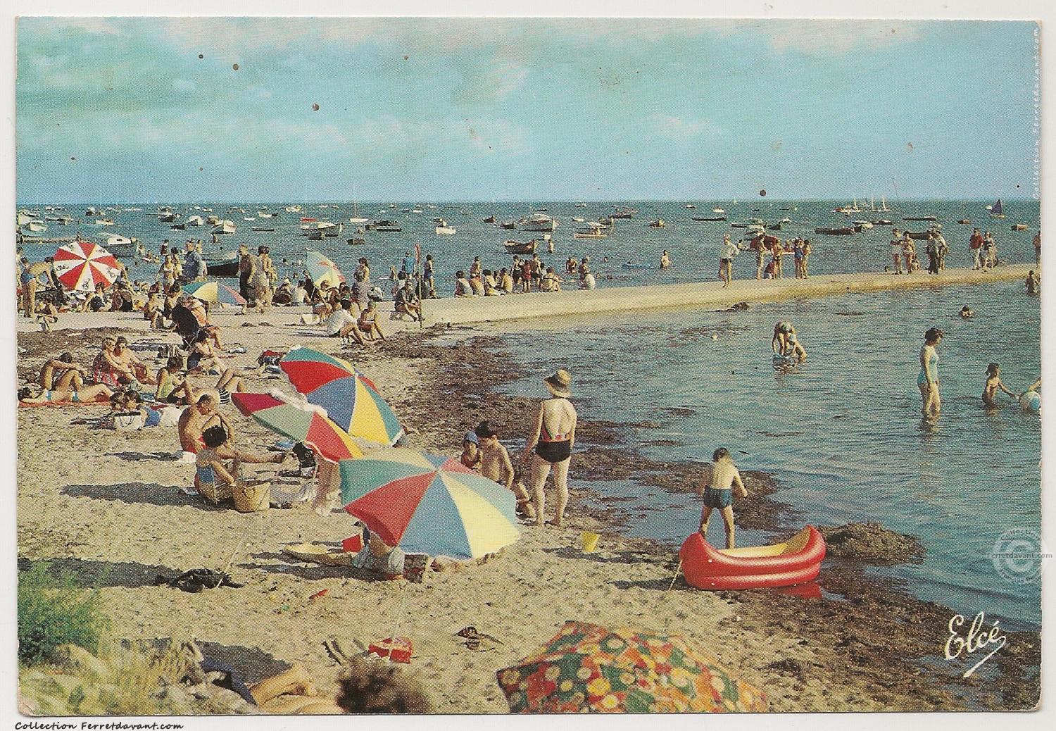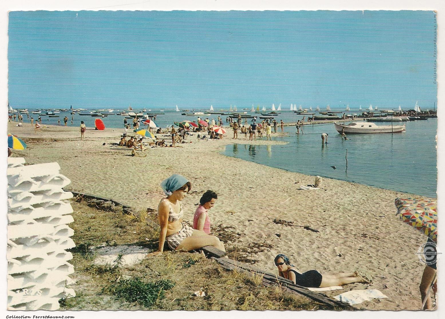 La plage d'Arès à marée haute dans les années 1960. A gauche, un tas de tuile chaulées (mélange de chaux et de sable) qui sera transbordé dans le Bassin pour la collecte des naissains d'huitres.