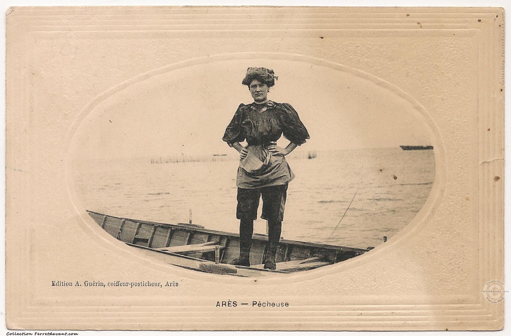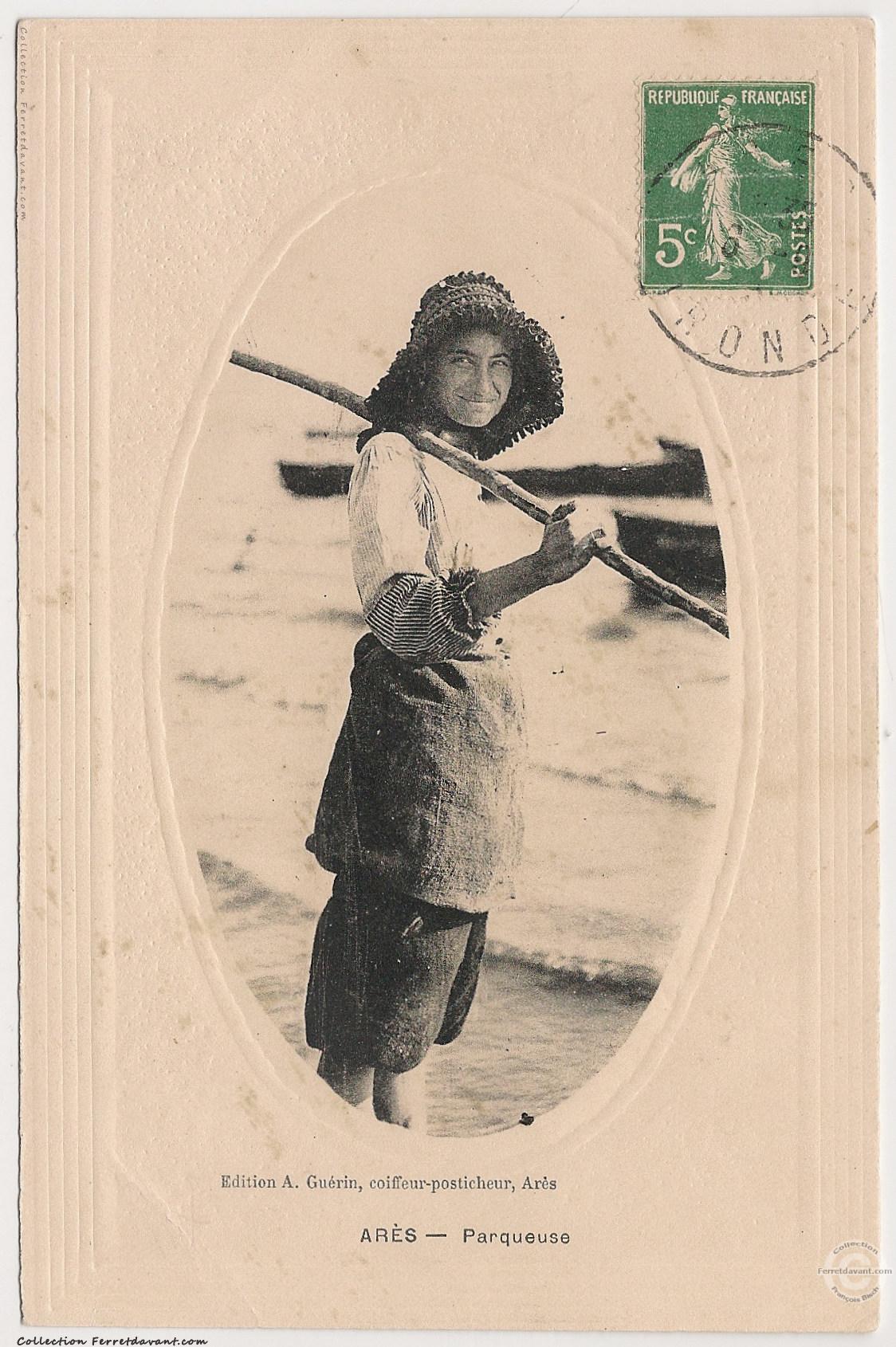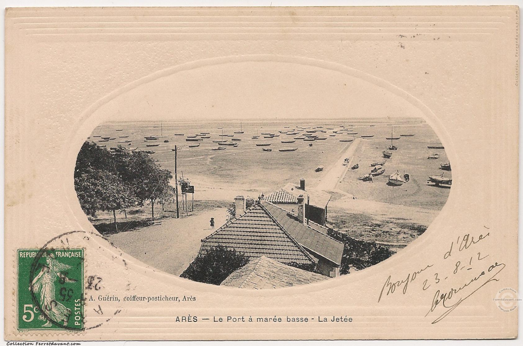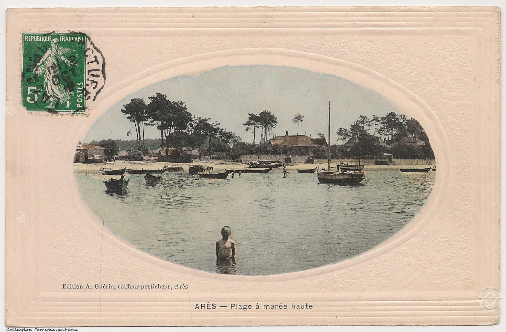 Rare carte postale de l'éditeur Aristide Guérin, coiffeur posticheur, place de l'église à Arès. Si je ne me trompe pas, il n'existe que 12 cartes couleurs de cet éditeur. Voir du même éditeur la carte postale de Piraillan