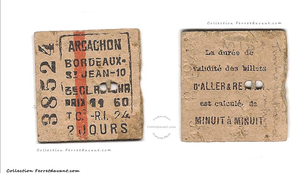 Vue recto/verso d'un tout petit billet de train (train ticket) de troisième classe n° 38524 Arcachon - Bordeaux Saint-Jean de la taille d'une pièce de 2 euros. Prix : 11,60 Francs. Poinçonné le 16 aout 1925. Au dos est écrit au crayon à papier : «Timbre quittance compris»
