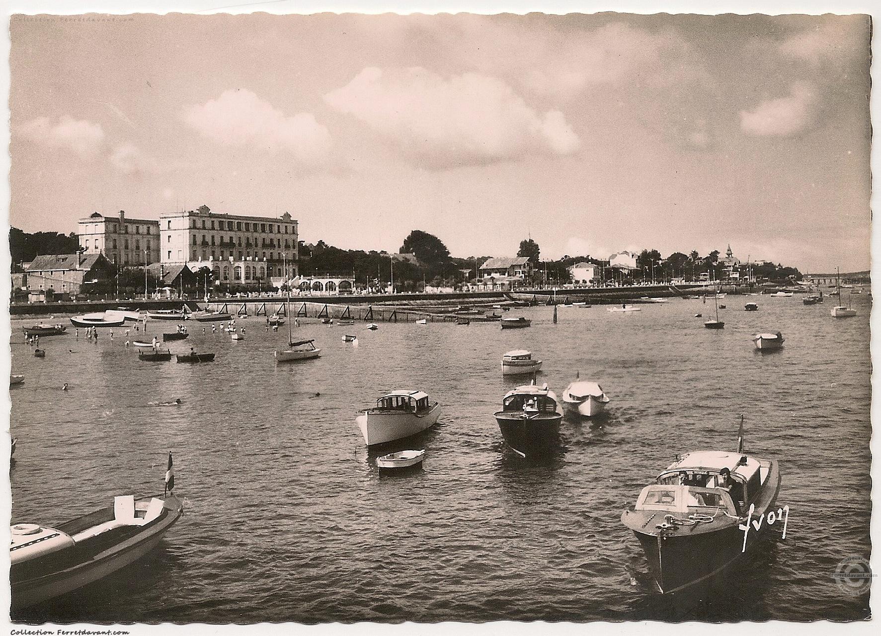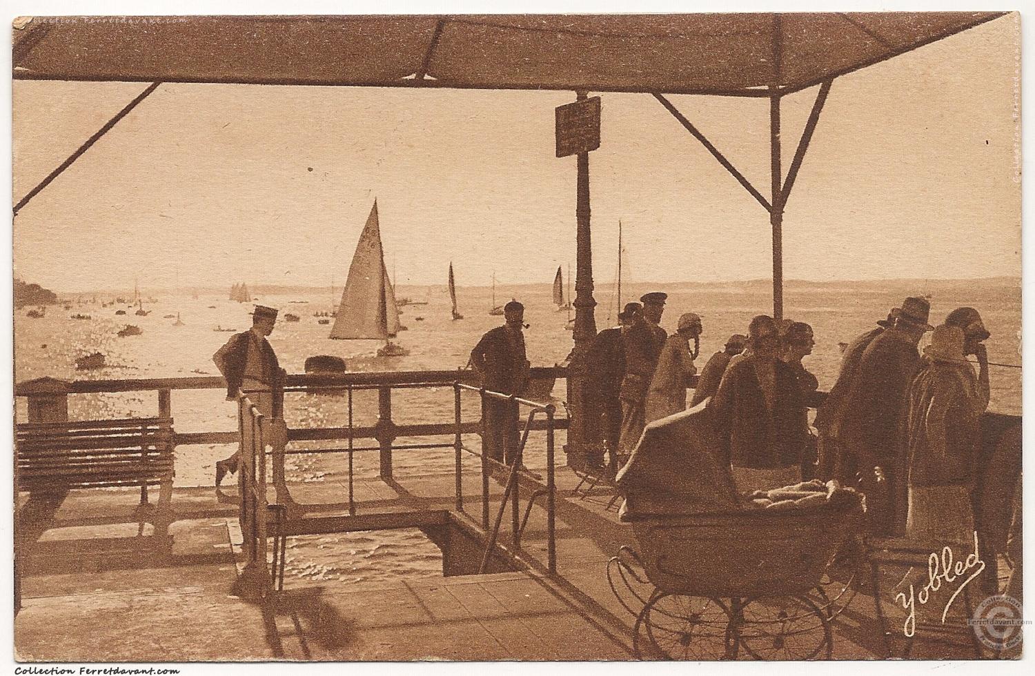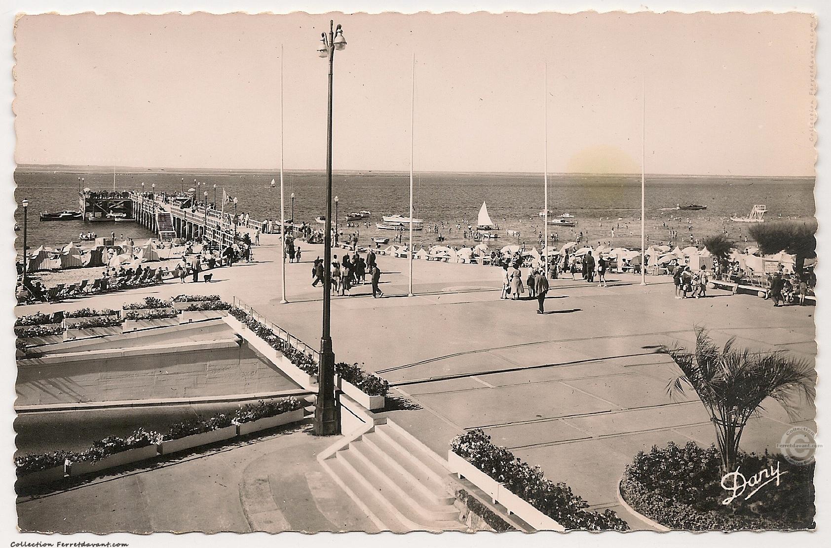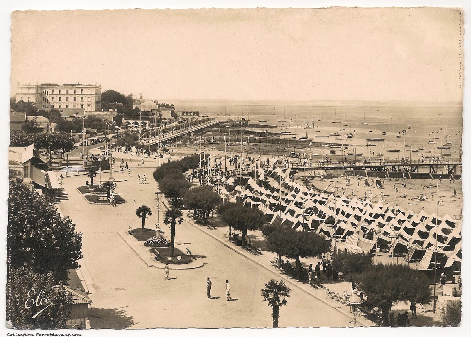 La plage, le boulevard promenade Gounouilhou, la jetée Thiers et le grand Hôtel d'Arcachon. Le souterrain, ouvert en 1951, n'existe pas encore. Remarquez les bancs en fonte de l'époque.