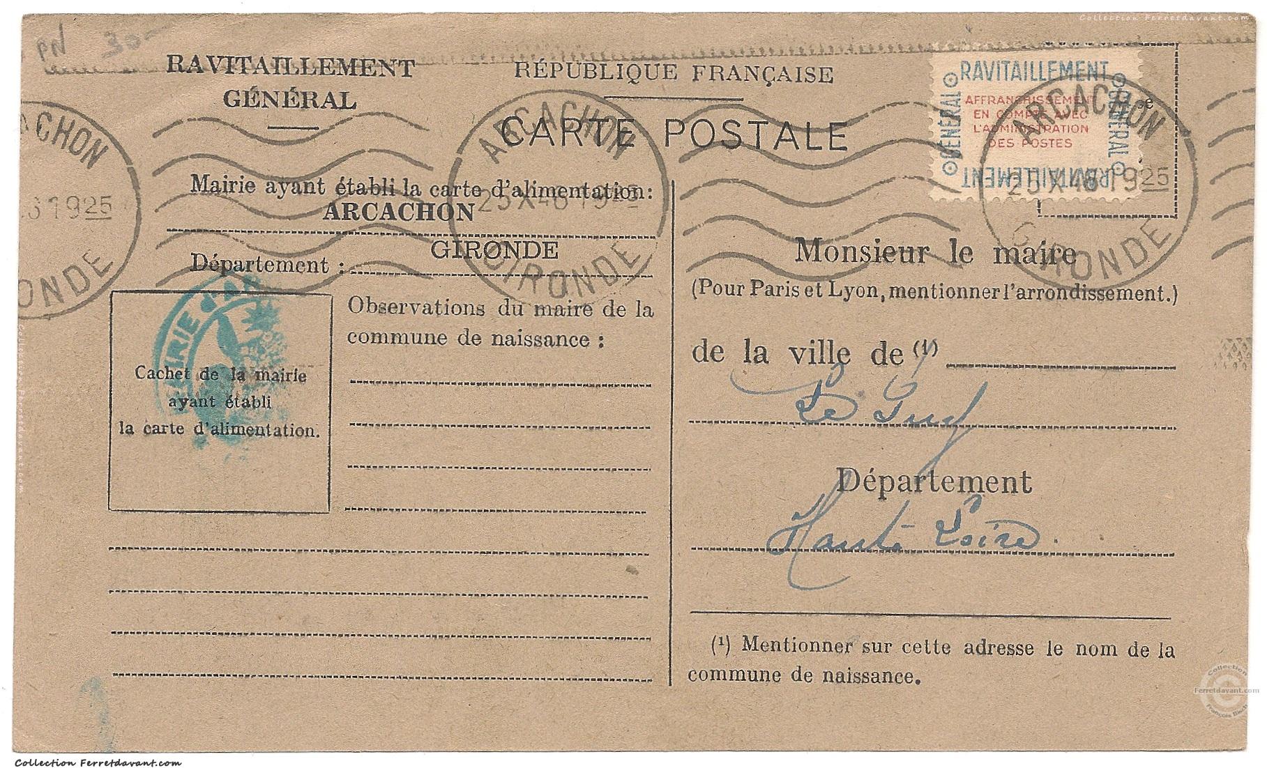 Carte d'alimentation pour le ravitaillement général d'une habitante d'Arcachon établie par la mairie d'Arcachon et envoyée à la mairie du Puy (Haute-Loire). Cette carte comporte au dos sa fiche de contrôle. A noter que cette carte est oblitérée avec une vignette de ravitaillement général. La mention "Affranchissement en Compte" signifie que l'utilisateur a payé pour cet envoi. Il s'agit d'une transmission administrative des droits aux tickets de ravitaillement.