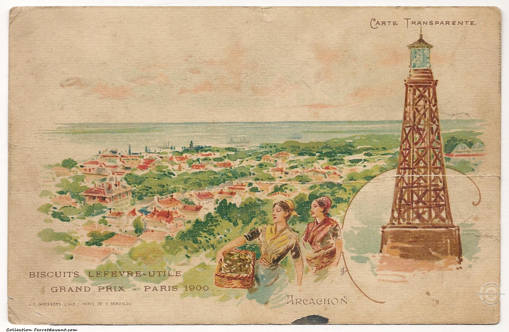 Carte publicité pour les biscuits Lefévre-Utile (LU) à l'occasion de l'exposition universelle de Paris 1900. Cette carte est éditée par la maison d'édition Goossens qui utilise ici la technique des cartes transparentes conçues pour créer des effets lumineux ou des inscriptions en forme de filigrane. Des reflets apparaissent dès que vous présentez la carte en contre jour devant une source de lumière (Lampe ou Soleil). A l'origine, c'est la marque "Météor" qui invente ce procédé et dépose un brevet. Mais comme on peut le voir ici, cette invention à été très vite copiée.