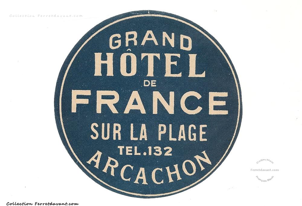 Véritable autocollant du Grand Hôtel de France d'Arcachon. Un des premiers hôtels d'Arcachon. A l'époque, le boulevard promenade n'existant pas, l'hôtel était au bord de l'eau d'où la phrase "Sur la plage". Il est détruit à la fin des années 1970. L'hôtel "Point France" a été construit sur son emplacement. Voir aussi la carte n°349