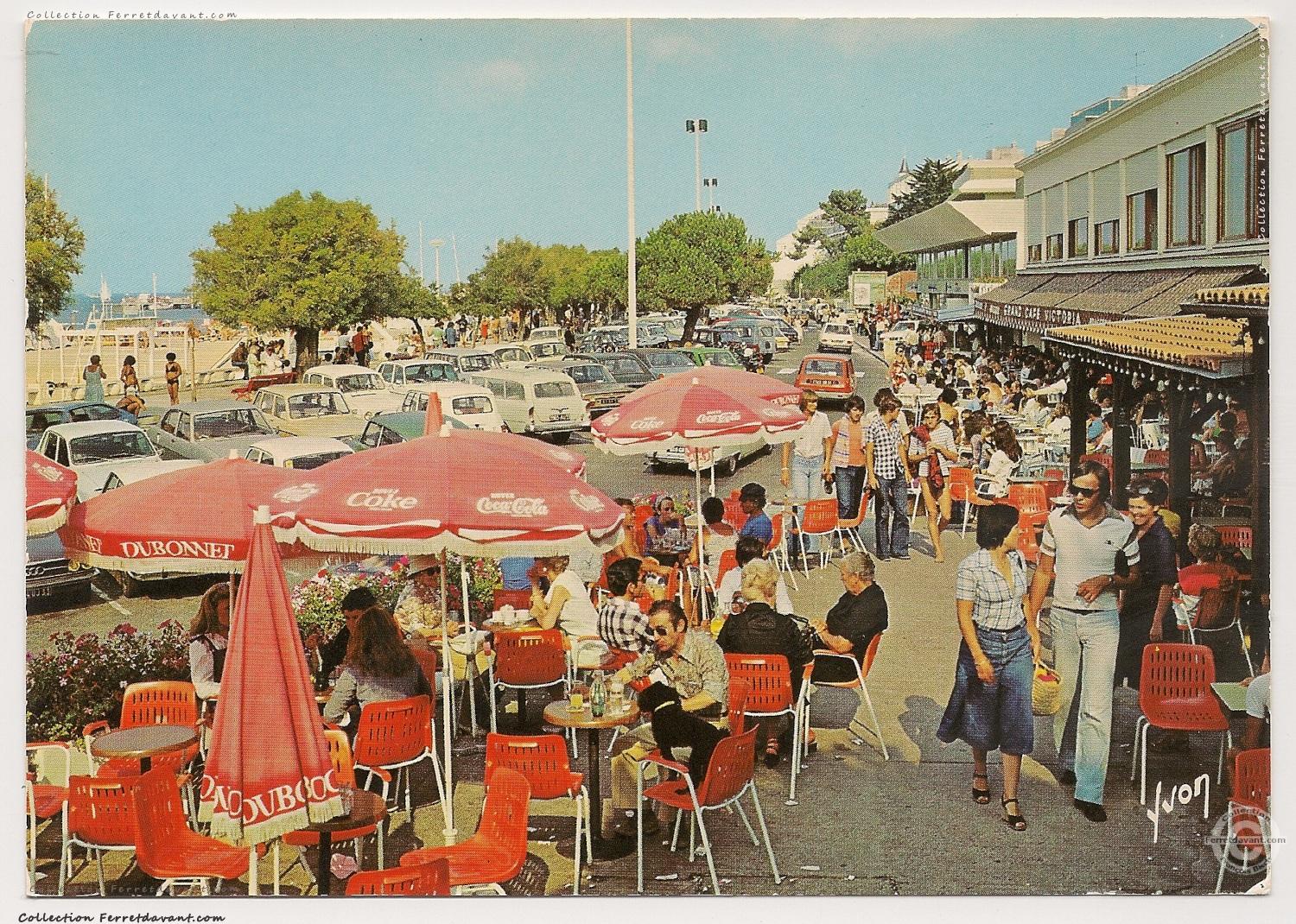 Les terrasses du Thiers et du Grand café Victoria dans les années 1980. On regarde en direction du Casino de la Plage (Deganne) dont on aperçoit une tourelle. Avec son avant toit blanc, l'hôtel "Point France" (34 chambres) est construit à la place de l'hôtel de France.