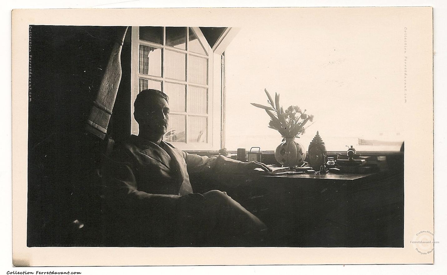Photo amateur de l'écrivain André Armandy à bord de son bateau ponton "Cœur Volant" (house boat) amarré dans la conche du Mimbeau au Cap-Ferret dans les années 1930. Remarquez, sur les rames, le double AA gravé dans le bois. Voir une autre photo du "Cœur Volant" ainsi qu'un petit entrefilet en bas de page de La Dépêche Algérienne du 27 juillet 1933.