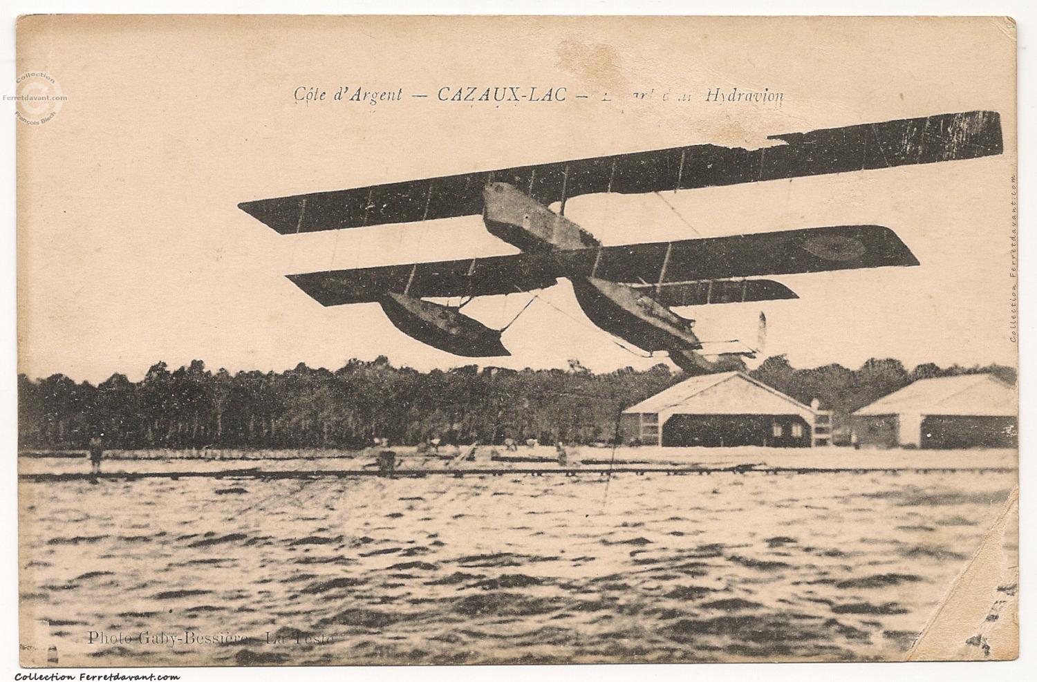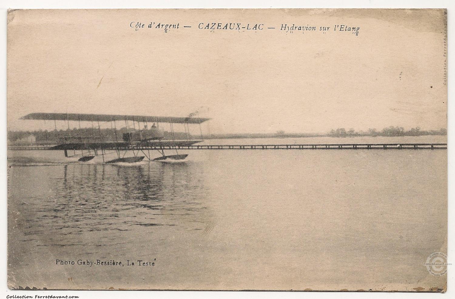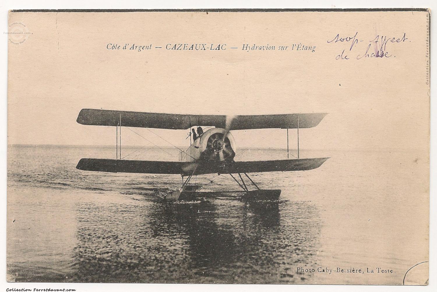 Hydravion de chasse sur l'étang de Cazaux. Est noté au dos : « [...] J'ai volé deux fois ce matin, le temp était superbe aussi nous nous sommes régalés. Nous commençons à taper très souvent en plein dans les cibles. Marcel Blané est arrivé hier avec un détachement de mitrailleurs à instruire [...] Les permissions ne sont pas rétablies aussi je ne sais ce qu'il en adviendra [...] » Voir aussi l'école d'hydravion Villiers du Cap-Ferret et les hydravions à Arcachon.