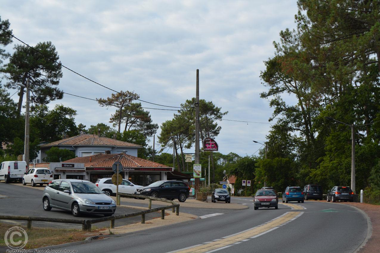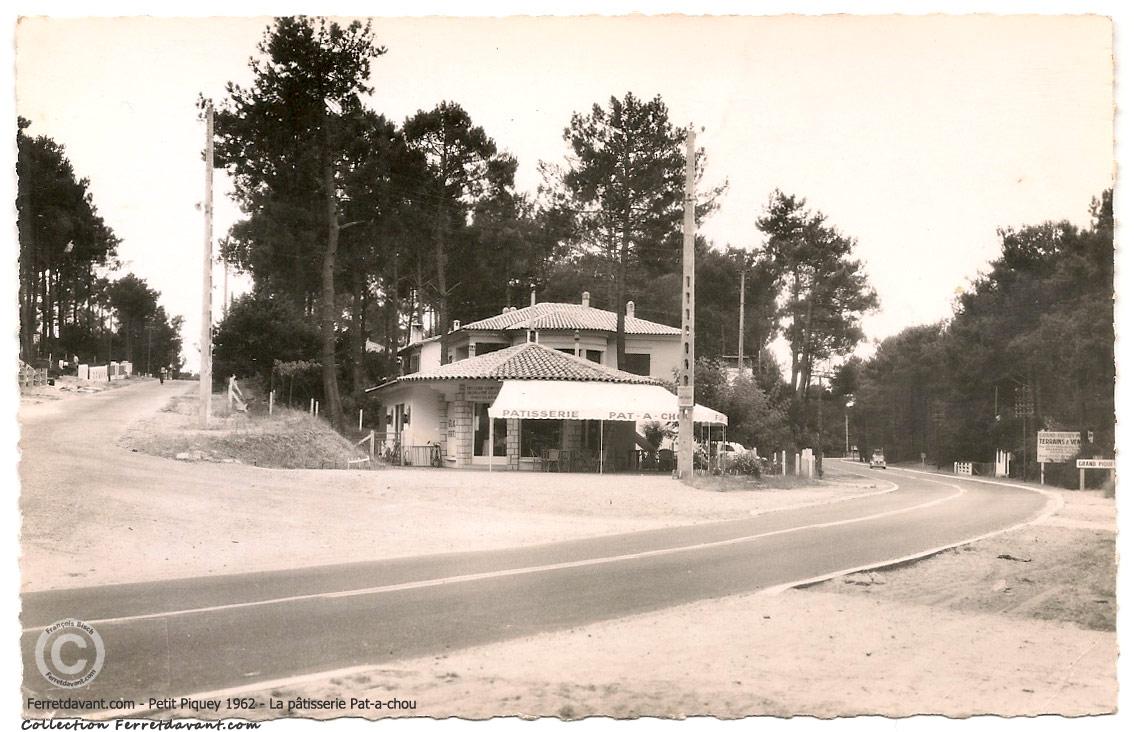 La pâtisserie Patachou en 1962. C'est à partir d'ici que l'on passait de la commune de Lège à celle de La Teste (avant le rattachement de commune de 1976). Remarquez le panneau de droite : "Grand Piquey : Terrains A Vendre - S'adresser à la Galerie de la Marine"