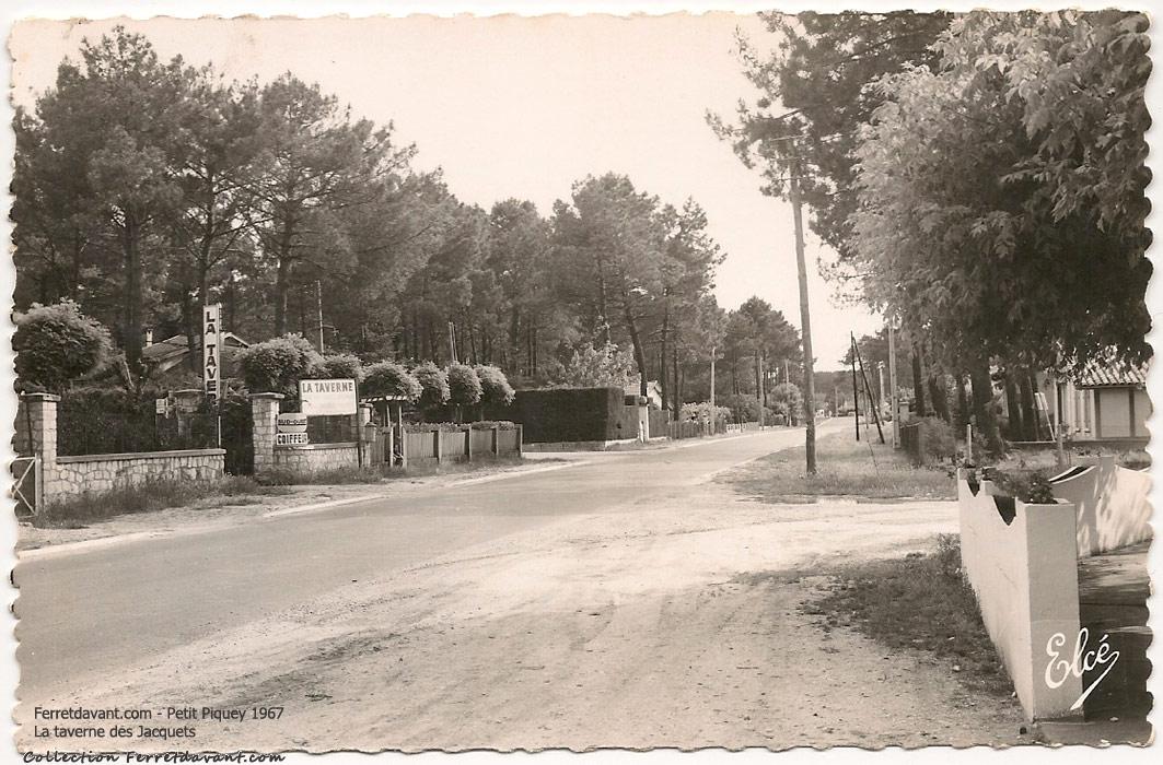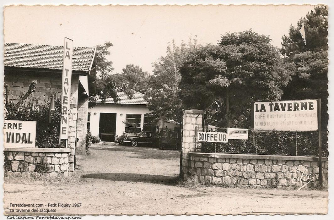 La Taverne des Jacquets tenue par la mère Vidal : Café - Bar - Tabac - Journaux - Alimentation générale - Boucherie - Coiffeur - Lavage - Repassage... Aujourd'hui, c'est toujours la Taverne (Bar, Tabac, Presse) tenue par Paul Lassale et Jacques Maurand jusqu'en 2017 et depuis novembre de la même année par Alexandra Peria et Alain Rezzesi (voir article Sud-Ouest de 2017). Contre la Taverne, c'est depuis de longue années le Casino mais depuis 2016, c'est Sandra et David qui ont repris l'affaire et qui vous accueil si agréablement au Petit Casino des Jacquets. Remarquez, au fond de la cour, à côté de la 2CV fourgonnette, la Panhard noir du constructeur automobile français Panhard & Levassor dont l'activité civile est arrêtée cette même année 1967.