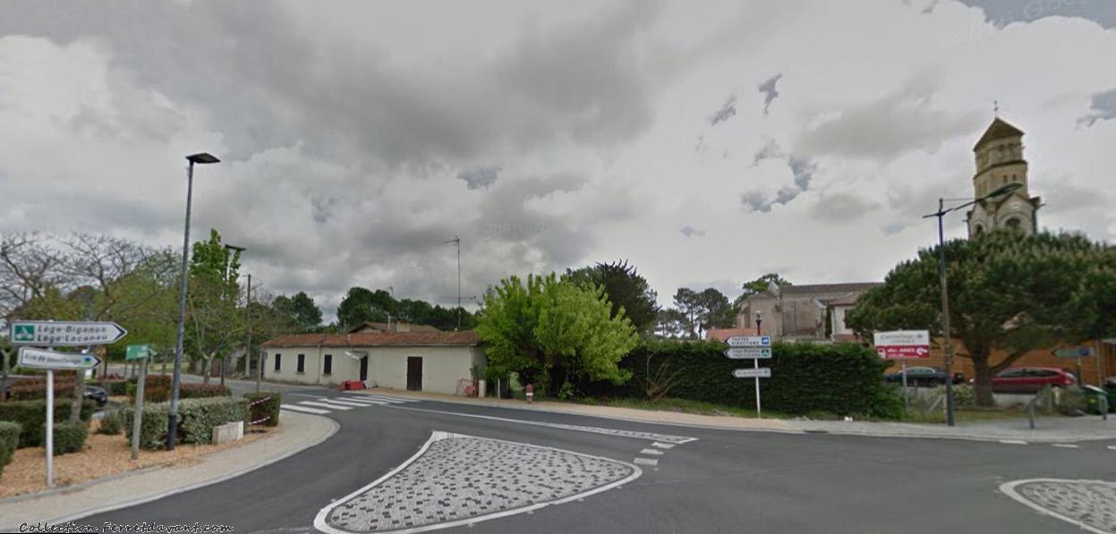 Nous sommes le 14 décembre 2016, avenue de la gare à Lège bourg. La vue de cette photo personnelle est opposée aux cartes précédentes. Nous sommes face au café Goubet (aujourd'hui, le restaurant Le Chat Toqué). A l'abandon, l'épicerie Darrouzes vient d'être rasée dans la matinée. C'est aujourd'hui un parking avec bornes de recharge électrique.