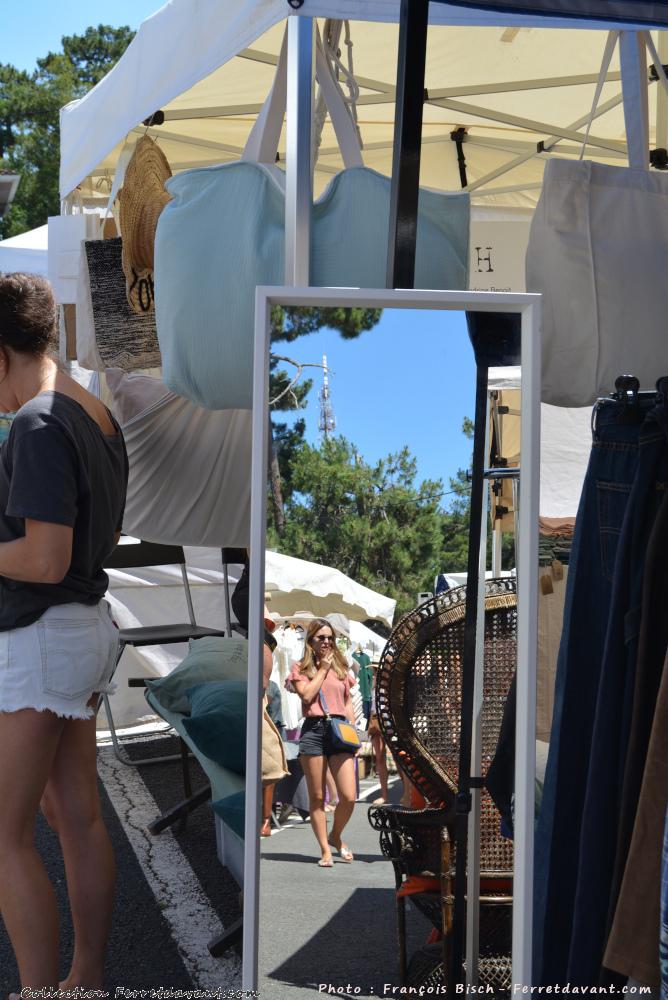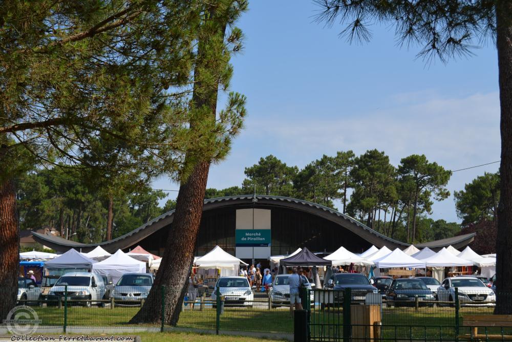 Vue aérienne du marché de Piraillan ouvert seulement les deux mois d'été. Au deuxième plan, les commerces, le port et le village de Piraillan. L'ancien camping des réservoirs est sur la gauche. Au loin, on aperçoit la jetée et la pointe aux chevaux de Grand Piquey.