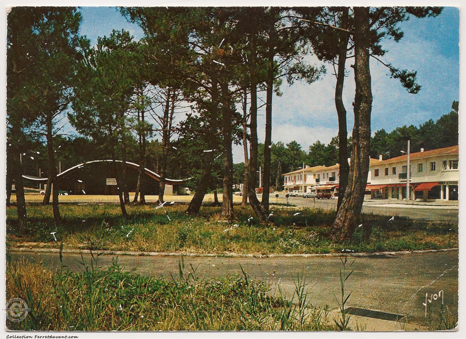 Le marché de Piraillan, les commerces et la place Sandhausen sur une carte postale écrite en juillet 1975. Ce marché est une réalisation de 1968 de l'architecte Jean-Claude Moreau, membre fondateur du collectif architectural bordelais AGORA (Ateliers Groupés pour l'Ordonnancement de la Recherche Artistique - qui à aussi réalisé la villa Heim et la villa Reyraud du Canon). Le nom de la petite place vient du jumelage en 1980 entre la ville de Sandhausen (maire Walter Reinhard) et de Lège-Cap Ferret (maire Robert Cazalet). Ouvert uniquement en été, le marché de Piraillan est livré par l'agence bordelaise AGORA en début de saison 1968.