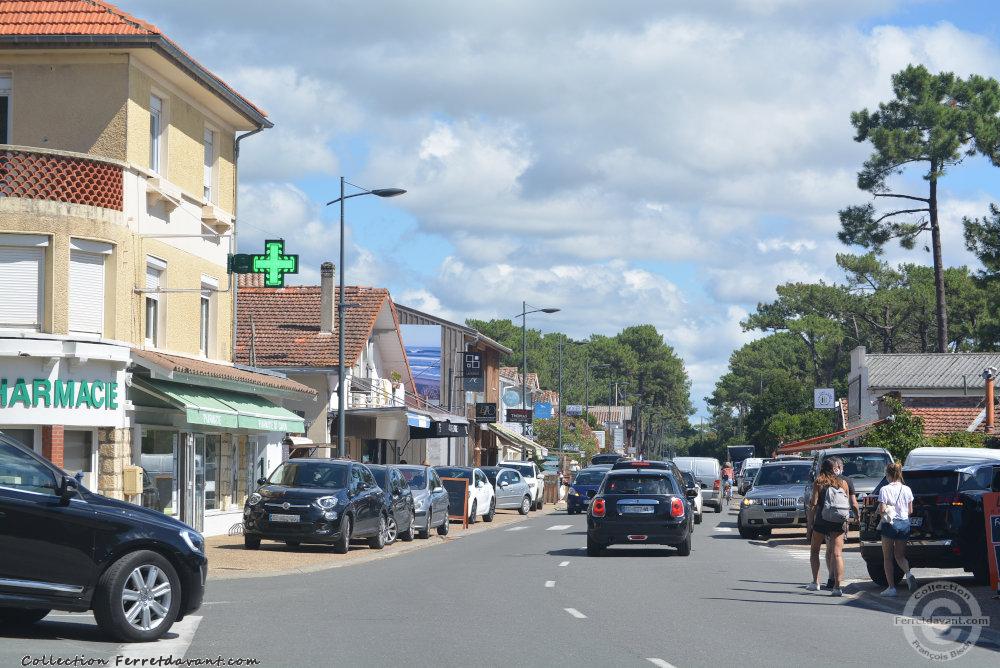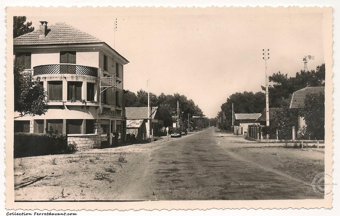 C'est la fin de saison au Canon. Les touristes sont partis. On redécouvre la presqu'île et ses voisins. On reprend le temps de vivre. Au premier plan, la route du Cap-Ferret et la pharmacie Bousquet. Remarquez les magnifiques Peugeot 402 de 1942.