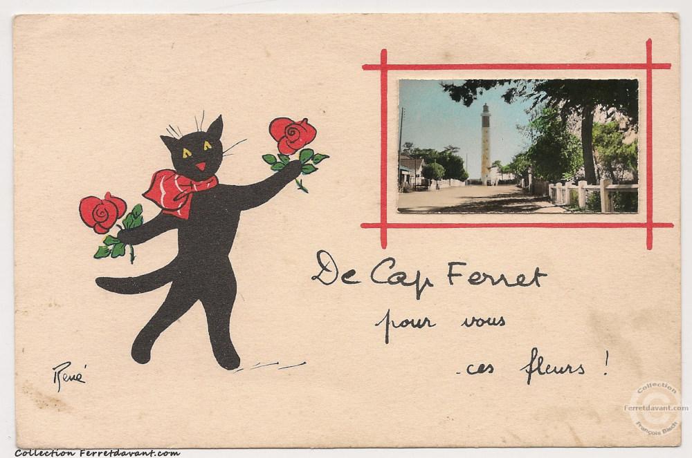 Carte dessinée (par René) avec une petite photo du phare du Cap Ferret découpée puis collée. Voir la carte du restaurant L'Escale réalisée avec le même procédé. A noter qu'au dos est écrit : « Adresse jusqu'au 20 août : villa Les Oyats, avenue des Goélands Cap Ferret »