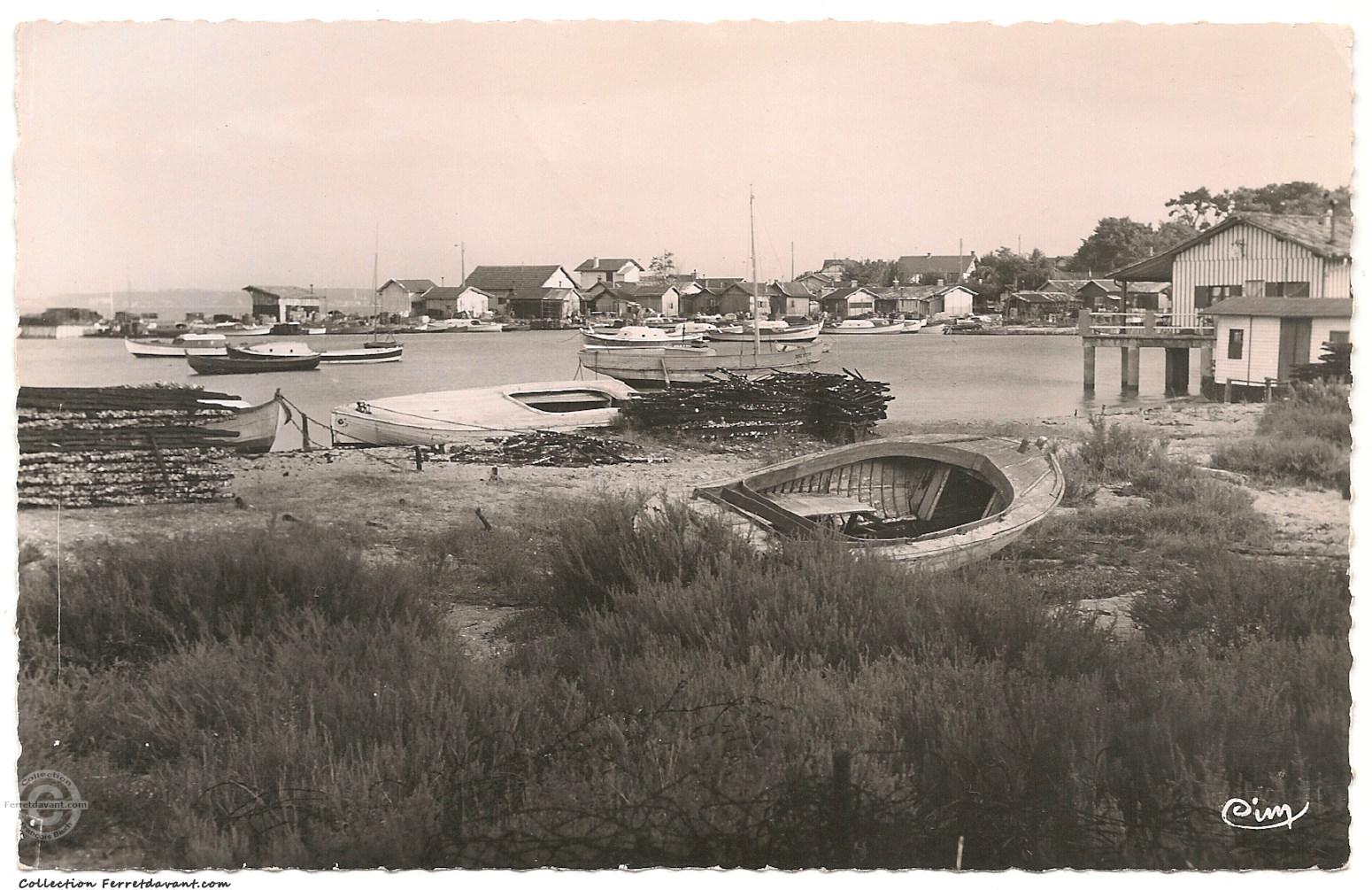 Vue sur le port de Piraillan depuis le quai Deschamps. A droite, la villa sur pilotis Lou Pitey (Pitey veut dire perchoir en Gascon). Devant la villa, on remarque une plate avec une petite cabane construite comme les anciens ponton. Remarquez que les deux îlots au centre du port de Piraillan ne sont pas encore construits.