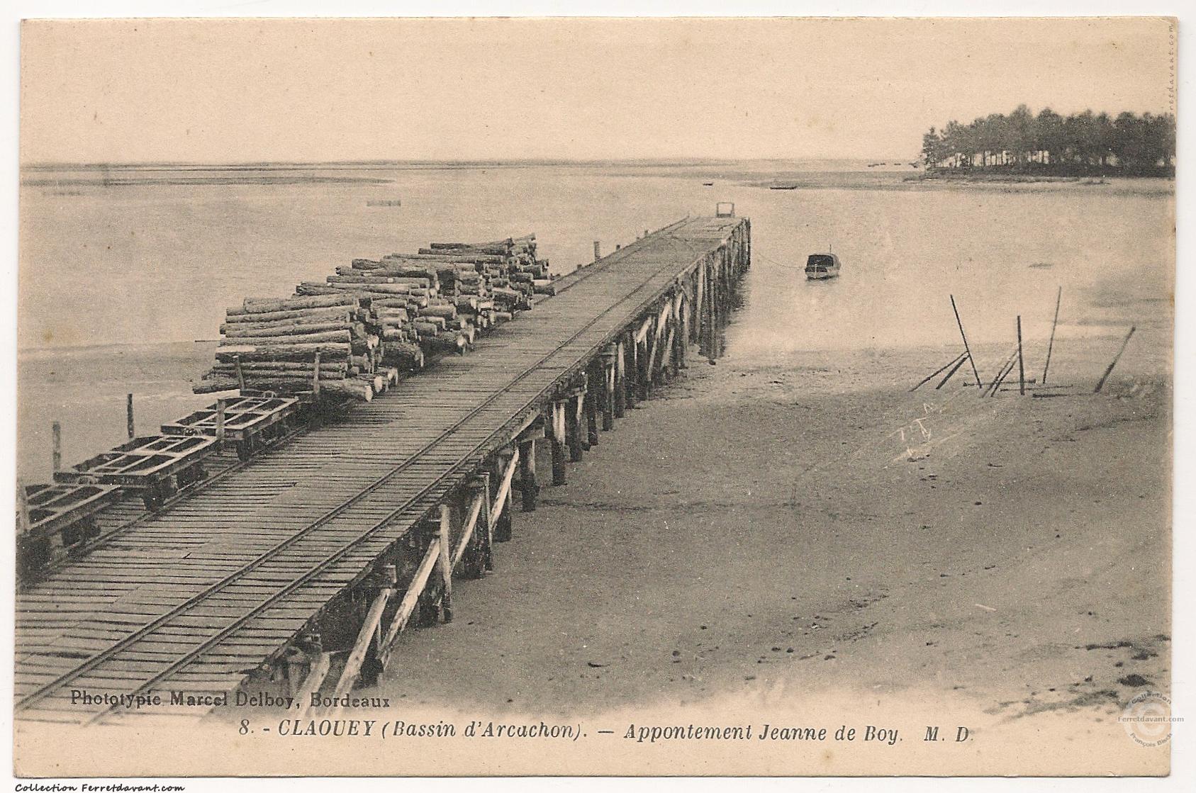 L'appontement Jane de Boy vers 1920 pour le transbordement du bois sur des bacs qui sont ensuite remorqués jusqu'au grands voiliers en partance pour l'Angleterre. Sur main droite, la plage des Pastourelles. Le nom du quartier Jane de Boy viendrait de jean des bois car Jean s'écrit Jan, en gascon. On devrais prononcer "Bois" et non pas "Boï" comme on l'entend souvent. Sur la carte, encore une variante dans l'écriture du nom.